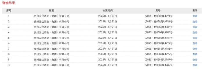 智通财经记者 | 张蕊 | 序号 | 姓名 | 立案时间 | 案号 | 查看 | | --- | --- | --- | --- | --- | | | 费州无忧酒业(集团)有限公司 | 2025年11月21日 | (2025) 黔0382执4791号 | 查看 | | 2 | 贵州无忧酒业(集团)有限公司 | 2025年11月21日 | (2025) 黔0382执4791号 | 查看 | | 3 | 费州无忧酒业(集团)有限公司 | 2025年11月21日 | (2025) 黔0382执4787号 | 查看 | | | 费州无忧酒业(集团)有限公司 | 2025年11月21日 | (2025) 黔0382执4788号 | 查看 | | 5 | 贵州无忧酒业(集团)有限公司 | 2025年11月21日 | (2025) 黔0382执4789号 | 查看 | | ୧ | 贵州无忧酒业(集团)有限公司 | 2025年11月21日 | (2025) 黔0382执4792号 | 查看 | | 7 | 费州无忧酒业(集团)有限公司 | 2025年11月21日 | (2025) 黔0382执4788号 | 查看 | | ...