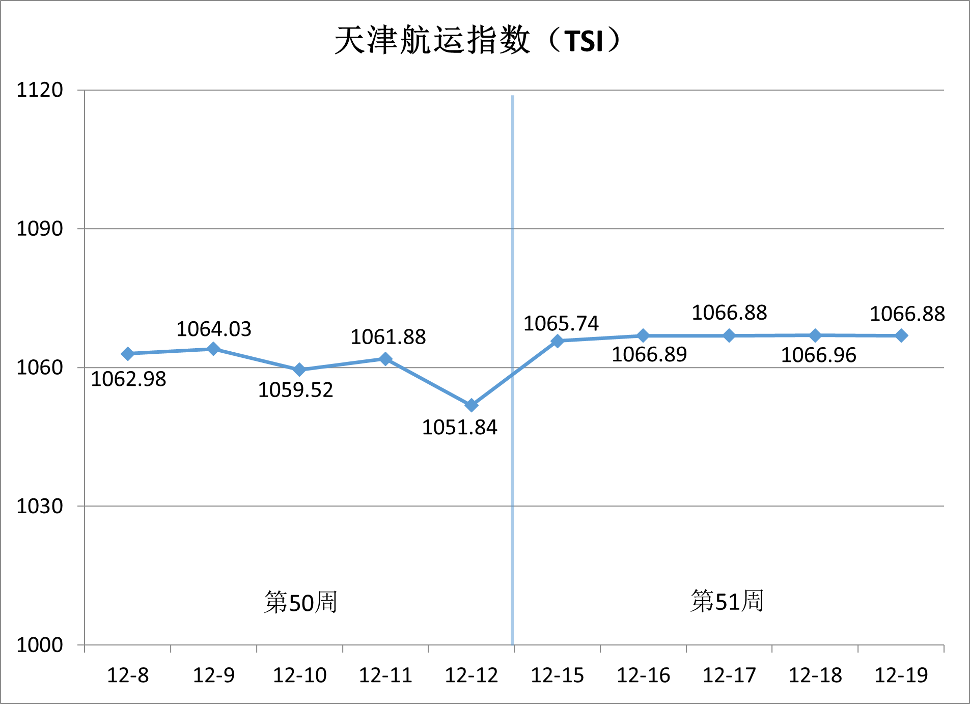 分类别看,北方国际集装箱运价指数快速上涨后缓步上行。其中,欧洲主要港口拥堵严重,班轮周转效率持续下滑,船公司征收滞期费、滞箱费等,带动运 价周环比上涨1.29%。地中海航线年末市场货量集中释放,运价涨幅较大,天津至地中海东部、天津至地中海西部航线运价指数分别上涨12.44%和10.63%。 美国航线由于我国2026年元旦启动钢铁及相关制品出口许可制度,国内工厂贸易商加快出货,市场货量回暖,运价震荡上涨,天津至美西、天津至美东航线 运价指数分别上涨5.48%和9.27%。最终,TCI收于1199.61点,相比12月12日累计上涨3.50%。 北方国际干散货运价指数止跌企稳。粮食市场运价延续弱势,累计跌幅为2.61%。北方国际煤运价指数小幅上涨0.73%。北方国际金属矿石运价指数累计上 涨2.00%。TBI最终收于1125.43点,相比12月12日上涨0.40%。 新华财经天津12月23日电(记者李亭) 记者从天津国际贸易与航运服务中心获悉,2025年第51周(12月15日-19日),中国北方内外贸海运价格的风向标 ——天津航运指数周初上涨后窄幅波动,最终收于1066.88点,相比12月12日(第50周最后一个发 ...