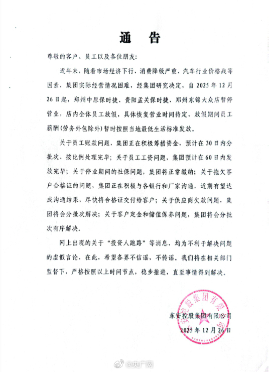 转自:北京日报客户端 近日,东安控股集团旗下的郑州中原、贵阳孟关两家保时捷中心疑似"闭店跑路",引发广泛关注。 12月26日,东安控股集团有限公司发布通告,否认"投资人跑路"的消息。 通告称,经集团研究决定,自2025年12月26日起,郑州中原保时捷、贵阳孟关保时捷、郑州东锦大众店 暂停营业,店内全体员工放假,具体恢复营业时间待定,放假期间员工薪酬(劳务外包除外)暂时按照 当地最低生活标准发放。 关于员工工资问题,集团预计在60日内发放完毕; 关于停业期间的社保问题,集团将正常缴纳; 关于拖欠客户合格证的问题,集团正在积极与各银行、厂家沟通,近期有望达成沟通结果,尽快将合格 证交付给客户; 关于供应商欠款问题,集团将会分批次解决; 关于客户定金和储值保养问题,集团将会分批次有序解决。 东安控股集团表示,将在相关部门监督下,严格按照以上时间节点,稳步推进,直至事情得到解决。 涉事郑州 中原保时捷中心门口被车堵住。图源:智通财经 关于员工账款问题,集团正在积极筹措资金,预计在30日内分批次、按比例处理完毕; 据媒体此前报道,多位网友近日发文称,位于郑州市中原区大中原国际汽车城的郑州中原保时捷中心突 然"人去楼空" ...