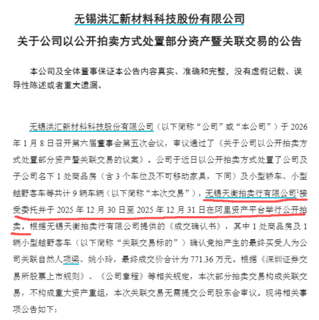 劳斯莱斯、宾利、奔驰,还有469㎡的大房子,上市公司洪汇新材的一场拍卖"秀"了房与车,而这批资产的接盘人中出现了现任董事长助理和董秘配偶的 身影。 1月8日,洪汇新材(002802)发布公告,公司于2026年1月8日召开董事会,审议通过《关于以公开拍卖方式处置部分资产暨关联交易的议案》。公司通过 公开拍卖方式处置1处商品房及9辆车辆,无锡天衡拍卖行有限公司、接受委托并于2025年12月30日至2025年12月31日在阿里资产平台举行公开拍卖。 据每日经济新闻,阿里平台2025年12月31日的一场商品房和9场汽车拍卖与之吻合。 根据无锡天衡提供的《成交确认书》,其中1处商品房及1辆小型越野客车确认竞拍产生的最终买受人分别为公司关联自然人项梁和姚小玲,最终成交价合 计为771.36万元。 公告称,项梁为公司副董事长项洪伟的儿子,现任公司董事长助理,过去12个月内曾任公司董事长。根据洪汇新材此前公告,项梁于1991年1月出生,为 高中学历。他于2020年接过父亲递来的接力棒,担任上市公司董事长,彼时不到30岁。 2024年年报则显示,项梁2023年9月起就读于University of California,Irv ...