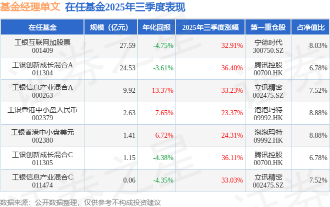 基金经理单文旗下基金表现概览 - 截至2025年三季度末,基金经理单文旗下共管理7只基金,本季度表现最佳的为工银创新成长混合A(011304),季度净值涨幅为36.4% [1] - 在管基金总规模合计约为67.29亿元,其中规模最大的为工银互联网加股票(27.59亿元),规模最小的为工银信息产业混合C(0.06亿元) [2] - 从2025年三季度单季度涨幅看,所有基金均实现正收益,涨幅范围在23.37%至36.40%之间,其中工银创新成长混合A(36.40%)和C类份额(36.11%)表现最为突出 [2] 单文管理基金持仓与历史业绩 - 在担任工银信息产业混合A(000263)基金经理的任职期间,累计任职回报为169.52%,平均年化收益率为12.74% [2] - 期间重仓股调仓次数共有98次,其中盈利次数为55次,胜率为56.12%;获得翻倍级别收益有7次,翻倍率为7.14% [2] - 各基金2025年三季度末的第一大重仓股及占净值比分别为:宁德时代(工银互联网加股票,8.03%)、腾讯控股(工银创新成长混合A,6.78%)、立讯精密(工银信息产业混合A,7.52%)、泡泡玛特(工银香港中小盘人民币/美元,8.88%) [2] 历史成功投资案例 - 华测检测(300012):在2018年二季度买入,2020年四季度卖出,持有约2年又2个季度,期间估算收益率达394.95%,持有期间公司归属净利润增幅为113.94% [3][5] - 阳光电源:在2020年三季度买入,2021年一季度卖出,持有期间估算收益率为300.71%,期间公司业绩增长25.15% [3] - 立讯精密:在2019年二季度买入,2020年三季度卖出,持有期间估算收益率为293.48%,期间公司业绩增长53.28% [3] - 宁德时代:在2020年四季度买入,2022年一季度卖出,持有期间估算收益率为102.04%,期间公司业绩大幅增长553.02% [3] - 先导智能(300450):在2017年三季度买入,2020年四季度卖出,持有约3年又1个季度,估算收益率为94.98%,持有期间公司营业总收入增幅达169.11% [3][5] 历史投资失误案例 - 紫金矿业(601899):在2024年二季度买入,三季度卖出,仅持有1个季度,估算收益率为-71.31%,但持有期间公司归属净利润增幅为51.76% [4][6] - 文化长城:在2016年四季度买入,2017年四季度卖出,估算收益率为-42.16%,持有期间公司业绩增长19.39% [4] - 圣邦股份:在2022年一季度买入,2023年二季度卖出,估算收益率为-39.44%,持有期间公司业绩下滑17.94% [4]