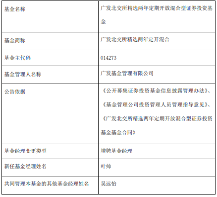 中国经济网北京7月24日讯 今日,广发基金公告,广发北交所精选两年定开混合增聘叶帅。 (责任编辑:康博) 叶帅2016年12月加入广发基金管理有限公司,曾任广发基金管理有限公司指数投资部研究员、投资 经理。 | 基金名称 | 广发北交所精选两年定期开放混合型证券投资基 | | --- | --- | | | 金 | | 基金简称 | 广发北交所精选两年定开混合 | | 基金主代码 | 014273 | | 基金管理人名称 | 广发基金管理有限公司 | | 公告依据 | 《公开募集证券投资基金信息披露管理办法》、 | | | 《基金管理公司投资管理人员管理指导意见》、 | | | 《广发北交所精选两年定期开放混合型证券投资 | | | 基金基金合同》 | | 基金经理变更类型 | 增聘基金经理 | | 新任基金经理姓名 | 叶帅 | | 共同管理本基金的其他基金经理姓名 | 吴远怡 | 广发北交所精选两年定开混合A/C成立于2021年11月23日,截至2025年7月23日,其今年来收益率 为38.76%、38.46%,成立来收益率为65.56%、63.15%,累计净值为1.6556元、1.6315元。 ...