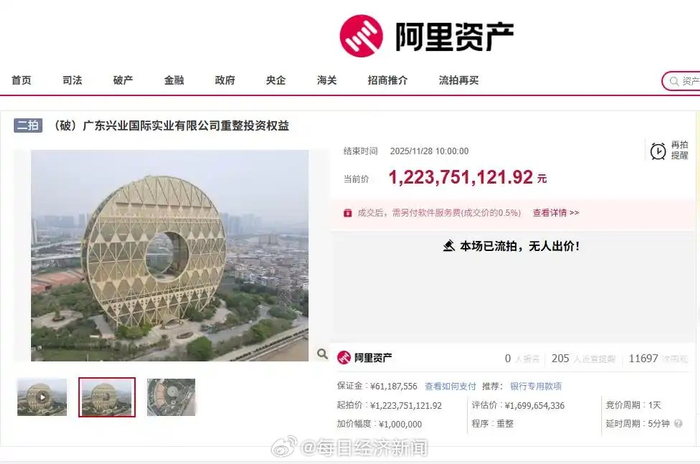 #广州铜钱大厦第4次拍卖流拍#【#广州铜钱大厦降1.36亿仍流拍#】11月28日上午10时,广州地标建筑 广州圆大厦第四次拍卖结束。此次拍卖虽有上万次围观,但无人报名,仍以"流拍"告终。阿里资产平台 显示,该拍品为广东兴业国际实业有限公司重整投资权益,所有人为广东兴业国际实业有限公司,权利 来源为"破产重整"。 2024年,广州市中级人民法院正式裁定鸿达兴业集团有限公司破产。直到今年11月中旬,广州圆大厦迎 来第三次拍卖,打8折后以13.6亿元起拍,因无人出价而流拍。(红星资本局,泽塔) 具体来看,该标的物包括2宗土地使用权、3项不动产以及固定资产,主要资产正是广州地标建筑——广 州圆大厦。整个标的物的评估价近17亿元,起拍价12.24亿元。 ...