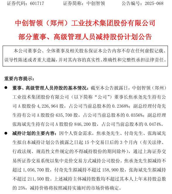 12月21日,中创智领(601717/00564)发布公告,董事长焦承尧、副总经理付奇和张海斌因个人资金需 求,计划在2026年1月14日至4月13日期间通过集中竞价方式减持股份,减持数量分别为不超过106万 股、16万股和21万股。 中创智领的主营业务是生产销售以液压支架、刮板机为主的煤矿综采设备,生产销售汽车零部件。公司 的主要产品是液压支架及其他煤机设备产品及物料、汽车动力系统零部件、底盘系统零部件、起动机及 发电机、新能源驱动电机零部件。 7月9日,公司发布公告,A股证券简称于7月15日由"郑煤机"变更为"中创智领",证券代码"601717"保持 不变。 公司在公告中指出,随着战略转型及业务结构的变化,目前已拥有煤矿机械、汽车零部件、工业智能等 多元业务,其中汽车零部件和工业智能业务收入占比超过50%。新证券简称"中创智领"寓意"中国创 造、智能引领",符合公司的发展战略和行业定位。 11月10日,公司发布公告,宣布公司英文名称由"ZMJ Group Company Limited"变更为"ZCZL Industrial Technology Group Company Limited",中文名称保持 ...