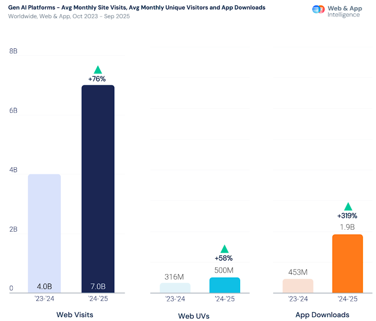 9月,全球AI月访问量达70亿次,同比增长76%,流量直逼社交网络