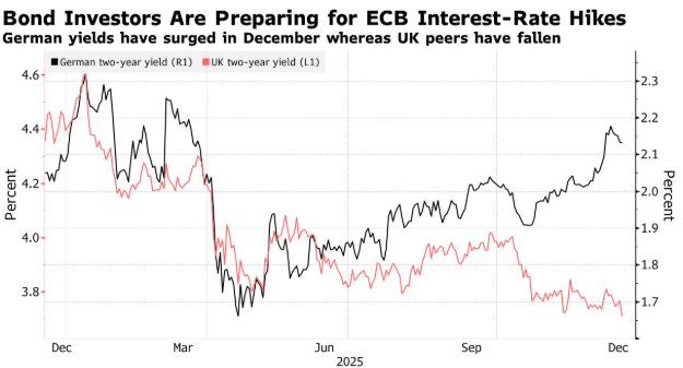 这促使交易员重新评估债券收益率和货币前景。鉴于欧洲央行可能再次收紧货币政策,作为欧元区基准 的德国两年期国债收益率本月已飙升约10个基点。 与此同时,英国国债收益率在12月份有所下降;预计英国央行将于周四将基准借贷成本下调25个基点至 3.75%,并计划在2026年年中前再次降息。周三,数据显示英国11月份通胀率低于预期,交易员们因此 加大了对降息的押注。货币市场目前预计,到2026年底,利率将下调66个基点。 Riddell表示:"英国是一个很大的例外",并补充说,可以通过做空英镑来预测英国央行将进一步降息。 智通财经APP获悉,交易员们越来越倾向于认为,欧洲各大央行几乎已经结束了降息进程。货币市场显 示,投资者预计欧洲央行、瑞典央行和挪威央行都将在明天的会议上维持利率不变,然后在 2026 年继 续基本保持利率不变。而且虽然市场已定价英国央行周四将降息,但即便周三公布的通胀数据较为疲 软,对英国央行的押注也仅考虑明年将只会再有一次降息。 这与今年早些时候的市场情绪发生了急剧转变,当时人们普遍认为欧洲各大央行将在2026年之前大幅降 息。富达国际基金经理Mike Riddell表示:"许多国家已经大幅降息— ...