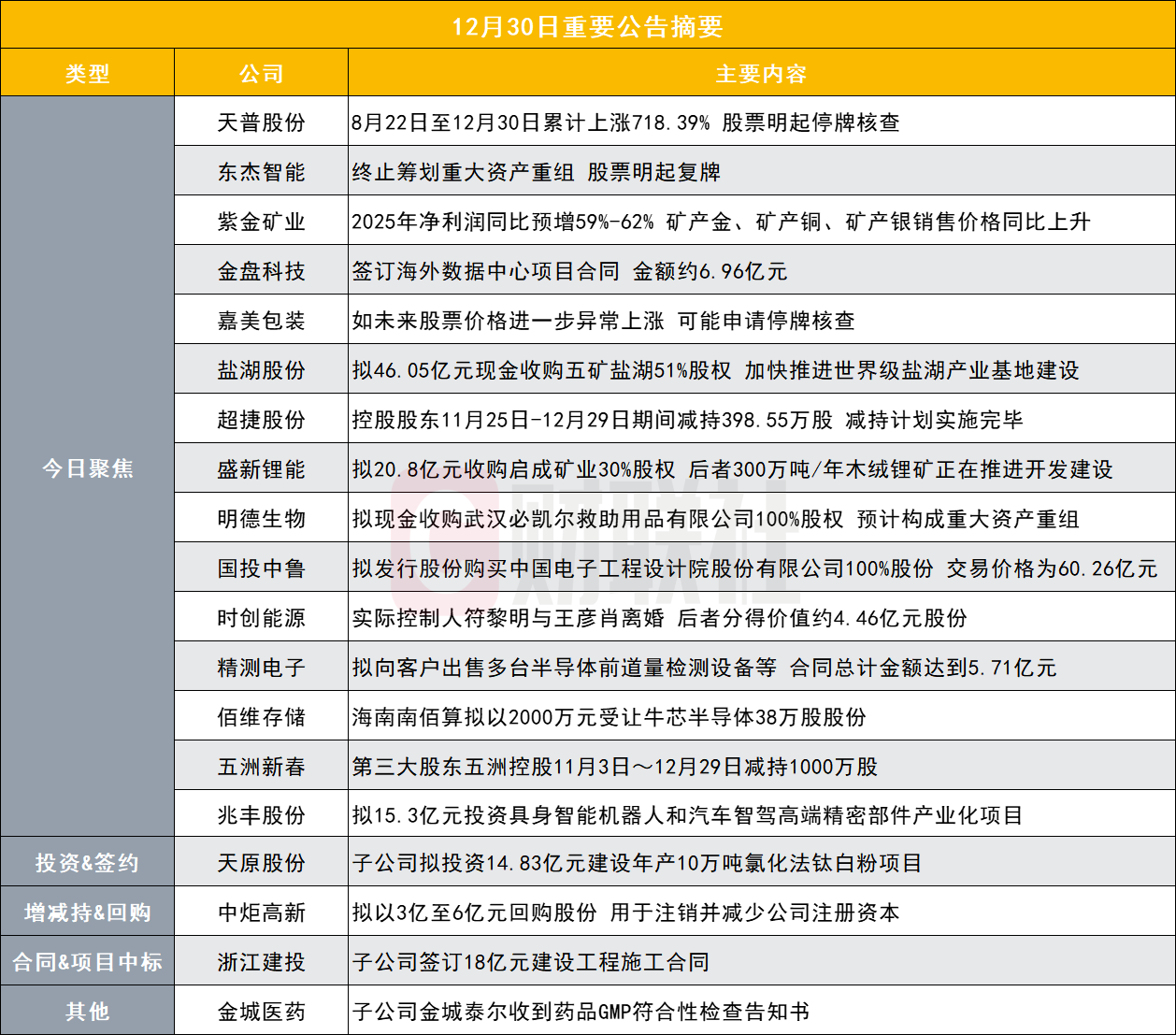核心观点 - 多家公司发布重大资本运作公告,涉及大规模并购、资产重组及战略投资,旨在扩大资源储备、延伸产业链或进入新业务领域 [5][7][9][15] - 部分公司股价出现剧烈异常波动,相关公司发布风险提示并可能或已经申请停牌核查 [1][4][30] - 多家公司获得重大合同或项目中标,主要集中在基础设施建设、数据中心及半导体设备领域 [3][11][23][24] - 数家公司计划发行H股赴港上市,以推进国际化战略并拓宽融资渠道 [27][28][29] 股价异动与核查 - **天普股份**:公司股票自8月22日至12月30日累计上涨718.39%,因股价严重偏离基本面,将于12月31日起停牌核查 [1] - **嘉美包装**:公司股票近期严重脱离基本面,如未来股价进一步异常上涨,可能申请停牌核查 [4] - **锋龙股份**:公司股票连续4个交易日涨停,累计涨幅偏离值达46.44%,市盈率与市净率与同行业差异较大,存在较高炒作风险,同时公司控制权将发生变更 [30] 业绩预告与生产计划 - **紫金矿业**:预计2025年度归母净利润为510亿元至520亿元,同比增长59%至62%,主要因主要矿产品产量增加及销售价格上升,并计划2026年矿产金产量105吨、矿产铜120万吨、当量碳酸锂12万吨、矿产银520吨 [2] 重大资产收购与重组 - **盐湖股份**:拟以46.05亿元现金收购五矿盐湖51%股权,以扩大钾锂资源控制规模,五矿盐湖拥有碳酸锂产能1.5万吨/年及钾肥产能30万吨/年 [5] - **盛新锂能**:拟以20.8亿元现金收购启成矿业30%股权,交易后将全资控股启成矿业,后者拥有资源量98.96万吨、平均品位1.62%的木绒锂矿,生产规模300万吨/年 [7] - **国投中鲁**:拟发行股份购买中国电子工程设计院100%股份,交易价格60.26亿元,交易后电子院将成为上市公司全资子公司,大基金二期将持有上市公司8.61%股份 [9] - **明德生物**:拟以现金方式收购武汉必凯尔救助用品有限公司100%股权,预计构成重大资产重组,以推动公司业务向工业与家庭场景延伸 [8] - **东杰智能**:决定终止筹划发行股份及支付现金购买遨博智能控股权的重大资产重组事项,股票将于12月31日复牌 [2] 战略投资与项目建设 - **兆丰股份**:拟投资15.3亿元建设具身智能机器人和汽车智驾高端精密部件产业化项目,达产后将新增年产50万只人形机器人滚珠丝杠、100万只滚柱丝杠、150万只智能驾驶转向系统丝杠及600万只智能驾驶制动系统丝杠的产能 [13][14] - **天原股份**:子公司拟投资14.83亿元建设年产10万吨氯化法钛白粉项目,建设期24个月 [15] - **中色股份**:控股子公司拟投资17.41亿元建设165万吨/年铅锌矿采选扩建项目,建设周期3年 [16] - **纵横股份**:拟定增募资不超过5.48亿元,用于无人值守与大型无人机系统产业化基地等项目 [26] 重要合同签署与项目中标 - **金盘科技**:签订海外数据中心项目合同,金额9899.22万美元,折合人民币约6.96亿元 [3] - **精测电子**:签订销售合同,向客户出售多台半导体前道量检测设备,合同总金额5.71亿元 [11] - **浙江建投**:子公司签订建设工程施工合同,暂定合同价18亿元 [23] - **神思电子**:中标济南数字低空飞行管理服务平台低空保障设施建设项目,中标金额1.998亿元,占公司2024年营收的21.92% [24] - **王府井**:已签订北京首都国际机场免税项目02标段合同,运营期自2026年2月11日起至2034年2月10日止,保底经营费1.13亿元 [25] 股权交易与增减持 - **时创能源**:实际控制人离婚并进行财产分割,王彦肖分得约3416.18万股公司股份,按收盘价13.07元/股计算市值约4.46亿元 [10] - **超捷股份**:控股股东于11月25日至12月29日期间累计减持398.55万股,占公司总股本2.97%,减持后持股比例降至45.37% [6] - **五洲新春**:第三大股东于11月3日至12月29日累计减持约1000万股,占公司总股本2.73% [13] - **中炬高新**:拟以3亿元至6亿元回购股份,用于注销并减少注册资本 [20] - **恒达新材**:股东龙游联龙计划减持不超过264.58万股,占公司总股本3% [21] - **弘讯科技**:股东帮帮忙计划减持不超过1212.66万股,占公司总股本3% [22] 子公司投资与股权收购 - **江波龙**:拟通过子公司以4608万美元购买控股存储器子公司Zilia Eletrônicos 19%股权,交易后将持有其100%股权 [16] - **中信特钢**:全资子公司拟以15.1亿元收购富景特100%股权,后者控股全球三大独立钢铁贸易商之一的斯坦科集团 [17] - **佰维存储**:全资子公司拟以2000万元受让牛芯半导体0.8446%股权(38.0066万股) [12] 计划发行H股 - **拓斯达**:拟发行H股股票并在香港联交所主板上市 [27] - **浙江荣泰**:拟发行H股股票并在港交所主板上市 [28] - **星宇股份**:拟发行H股股票并在香港联交所上市 [29] 其他重要事项 - **金城医药**:子公司金城泰尔米拉贝隆原料药通过药品GMP符合性检查 [31] - **南天信息**:公司及子公司补缴税款及滞纳金合计5030.94万元,将计入2025年当期损益,影响当期归母净利润5030.94万元 [32] - **苏州科达**:控股股东等拟协议转让公司5%股份,转让总价2.72亿元 [18] - **挖金客**:控股股东拟以31.67元/股协议转让公司5%股份(507万股) [19]