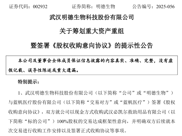 又有上市公司筹划重大资产重组。 明德生物(002932)12月30日晚间公告,公司与蓝帆医疗股份有限公司(简称"蓝帆医疗")签署《股权收购意向协议》,双方就公司 以现金方式收购武汉必凯尔救助用品有限公司(简称"标的公司")100%股权的交易达成框架性意向,并明确双方后续就本次交易 进行收购工作安排以及签署正式收购协议等事项。本次交易完成后,标的公司将成为公司的全资子公司。 公告显示,根据初步测算,本次交易预计构成《上市公司重大资产重组管理办法》规定的重大资产重组。本次交易拟采用现金方 式,不构成重组上市,不涉及上市公司发行股份。本次交易不构成关联交易,也不会导致上市公司控股股东和实际控制人变更。 本次交易公司将按照相关规定履行相关程序,编制、披露相关文件。 据了解,标的公司是较早引入国际第一急救(FirstAid)理念和技术的企业,主要从事以急救包为核心,全面布局应急装备、应急 单品和应急服务的应急救护业务。 明德生物表示,本次交易是公司基于聚焦急危重症业务板块战略发展需求所做出的重要布局。标的公司作为应急防护领域的领先 企业,长期服务于海内外高质量工业端客户,并积极向家庭消费端延伸。公司与标的公司在产品线与 ...