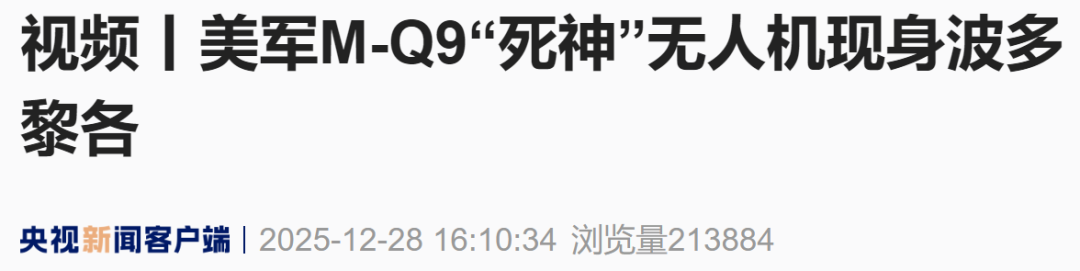 地缘政治与军事动态 - 美军MQ-9"死神"无人机于当地时间12月27日出现在美国海外属地波多黎各的机场 [1] - 美国以"缉毒"为由,近期在加勒比海地区持续加强军事存在 [1] - 美军已在委内瑞拉附近集结了包括航母、战斗机、运输机和无人机在内的庞大军事力量 [1] 能源资源与相关行动 - 委内瑞拉方面表示,美国近期施压的目的是为了夺取该国的石油等资源 [1] - 自本月10日以来,美国已三次在委内瑞拉附近海域对涉及委内瑞拉的油轮实施拦截行动 [1] - 美国声称没收了被拦截油轮上所载的原油 [1]