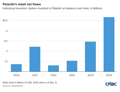Vanda的数据显示,Palantir有望成为今年净买入金额排名第五的证券,仅次于特斯拉(TSLA.US)、英伟 达(NVDA.US)等超大市值股票,以及追踪整个美国股市基准的SPDR标普500ETF(SPY)等热门交易型基 金。 Vanda负责追踪散户资金流向的副研究主管Viraj Patel表示:"表现非常亮眼。Palantir某种程度上已经被 纳入了那批AI科技'门面担当'的行列。" 智通财经APP获悉,根据VandaTrack的数据,今年以来截至12月8日,散户投资者已向Palantir Technologies(PLTR.US)这只股票投入近80亿美元。这一数字较上年增长逾80%,较2023年更是暴增超过 400%。近几年在人工智能(AI)热潮推动下取得的惊人涨幅,使这只股票无可争议地成为散户投资世界 的明星——尽管华尔街始终对其估值心存疑虑。 "疯狂"的商业模式 随着股价腾飞,Palantir赢得了大量散户投资者的青睐。其股价在2025年迄今已累计上涨逾150%,有望 连续第三年实现三位数涨幅。过去三年里,该股累计暴涨近3000%,远远跑赢同期上涨约80%的标普 500指数,以及上涨逾120%的以 ...