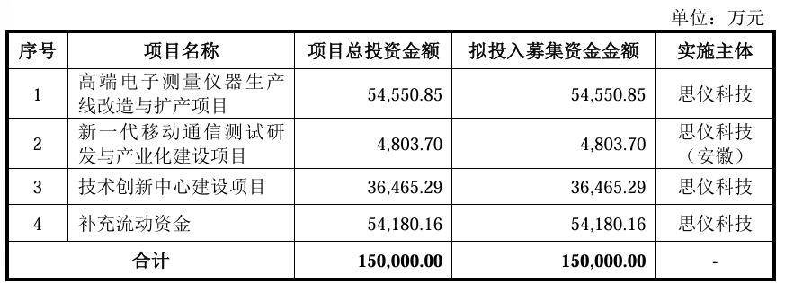 | 序号 | 项目名称 | 项目总投资金额 | 拟投入募集资金金额 | 实施主体 | | --- | --- | --- | --- | --- | | 1 | 高端电子测量仪器生产 线改造与扩产项目 | 54,550.85 | 54.550.85 | 思仪科技 | | 2 | 新一代移动通信测试研 发与产业化建设项目 | 4,803.70 | 4,803.70 | 思仪科技 (安徽) | | 3 | 技术创新中心建设项目 | 36.465.29 | 36.465.29 | 思仪科技 | | 4 | 补充流动资金 | 54,180.16 | 54,180.16 | 思仪科技 | | | 合计 | 150,000.00 | 150,000.00 | - | 瑞财经 王敏 12月24日,中电科思仪科技股份有限公司(以下简称"思仪科技")创业板IPO获受理,保荐机构为国泰海通证 券,保荐代表人为张彬、薛波。 据悉,思仪科技曾于2022年12月申请上市获上交所科创板受理,保荐机构为中信证券,经过1轮的问询与回复后,因思仪科技 及其保荐人撤回发行上市申请,2023年6月21日,上交所终止其发行上市审核。 招股书显示,思 ...