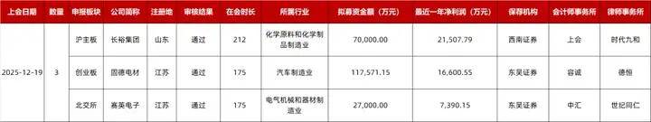 文 /梧桐数据中心 12月19日,IPO共审核3家公司(沪主板、创业板、北交所各1家),3家均获通过。 单位:万元 | | | 沪主板 | | | | | --- | --- | --- | --- | --- | --- | | 公司简称 | 主营业务 | 2024年营收 | 2024年净利润 | 审核结果 | 保荐/律所/审计 | | 长裕集团 | 错类产品、特种尼龙 产品、精细化工产品 | 163,767.78 | 20.841.83 | 簡対 | 西南证券/时代九 | | | | | | | 和/上会 | | | 的研发、生产和销售 | | | | | | | | 创业板 | | | | | 公司简称 | 王喜亦吴 | 2024年营收 | 2024年净利润 | 审核结果 | 保存/律所/审计 | | | 新能源汽车动力电池 热失控防护零部件及 | | | | 东吴证券/北京德 | | 固德电材 | 电力电工绝缘产品的 | 90,791.86 | 17,301.99 | 通付 | 恒/容诚 | | | 研发、生产和销售 | | | | | | | | 北交所 | | | | | 公司简称 | 主营业务 ...