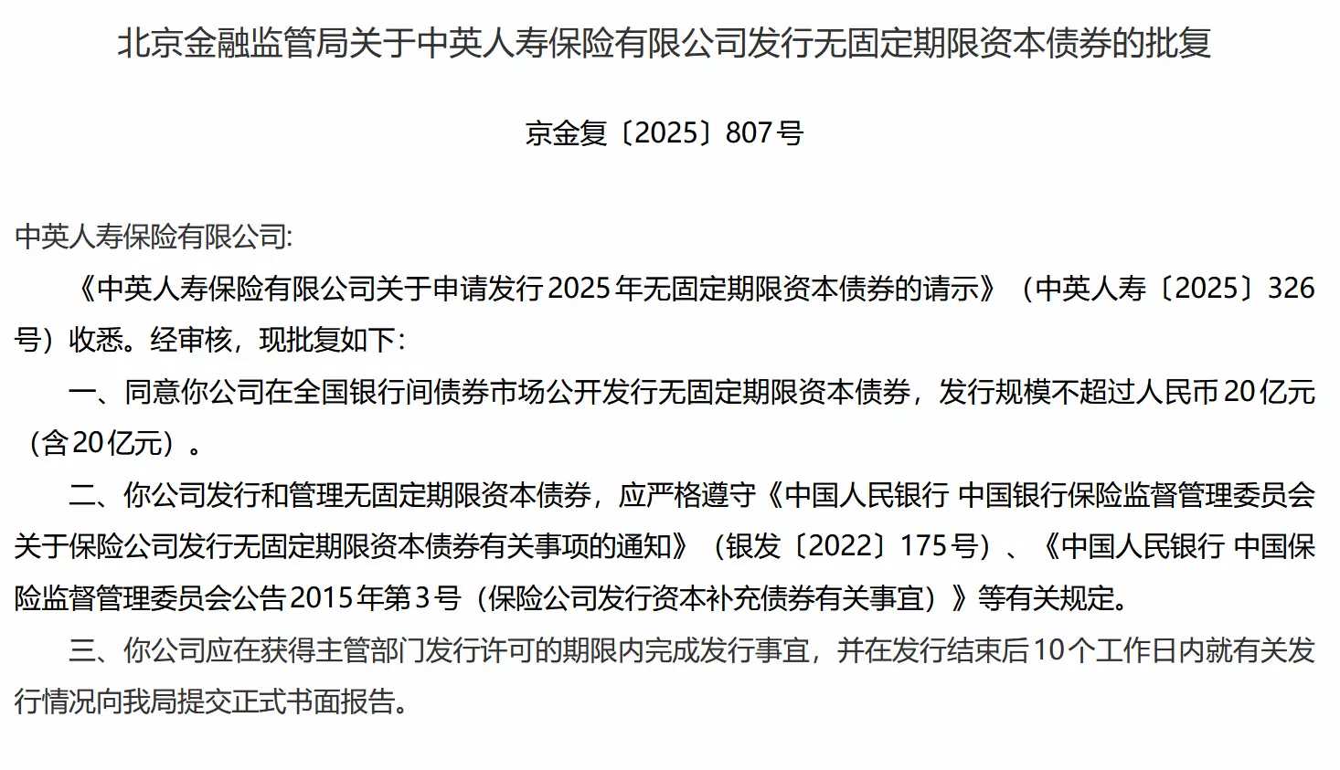 监管批复与发行计划 - 北京金融监管局于2025年12月9日批复同意中英人寿保险有限公司发行无固定期限资本债券 [1] - 债券发行场所为全国银行间债券市场 发行规模不超过人民币20亿元 [1] 发行合规要求 - 债券发行与管理需严格遵守中国人民银行及银保监会的相关规定 包括银发〔2022〕175号文及2015年第3号公告 [1] - 公司需在获得发行许可的期限内完成发行 并在发行结束后10个工作日内向北京金融监管局提交正式书面报告 [1]