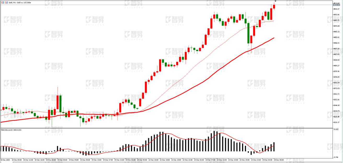 黄金方面:美国财长贝森特表示,可能会重新考虑美联储的通胀框架,并称他更加倾向于设定通胀区间而非固定目标。贝森特甚至暗示美联储新任主席可能 会考虑废除点阵图,这一举措将标志着美联储政策前景可能发生重大的变化。 另外近期地缘摩擦有所升温,投资者需要重点关注美国和委内瑞拉的关系可能出现进一步恶化的风险;以色列和伊朗可能再起冲突。 需求端看,截至12月12日当周,美国炼油厂产能利用率为94.8%,环比上升0.3个百分点,数据显示美国原油需求有所改善。 综合来看,在供给端有所收窄,需求端略有改善的情况下,原油价格反弹行情有望进一步延续。 技术面:日线上,本周行情延续上行,显示近期行情比较坚挺。指标上看,行情有望站上20日均线,一旦有效上破,则油价有机会挑战上方60美元关口。日 内关注下方58美元一线支撑情况。 原油价格走势图:原油小时图 智昇研究资深分析师辰宇认为,贝森特的言论令市场再度押注美联储宽松,叠加避险情绪升温,黄金价格表现强势。 技术面:日线上,连续多个交易日行情破位上行且收阳线,近期多头强势。20日均线和62日均线延续上行,显示多头主导行情。日内关注下方4455美元一线 支撑情况。 黄金价格走势图:黄金小时 ...