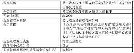 易方达MSCI中国A股国际通ETF成立于2018年5月17日,截至2025年10月17日,其今年来收益率为 18.48%,成立来收益率为86.49%,累计净值为1.8649元。 | 基金名称 | 易方达 MSCI中国 A 股国际通交易型开放式指数 | | --- | --- | | | 证券投资基金 | | 基金简称 | 易方达 MSCI 中国 A 股国际通 ETF | | 基金主代码 | 512090 | | 基金管理人名称 | 易方达基金管理有限公司 | | 公告依据 | 《公开募集证券投资基金信息披露管理办法》 | | | 《基金管理公司投资管理人员管理指导意见》 | | | 《易方达 MSCI中国 A 股国际通交易型开放式指 | | | 数证券投资基金基金合同》 | | 基金经理变更类型 | 增肥来会经理 | | 新任基金经理姓名 | 昌方 | | 共同管理本基金的其他基金经理姓名 | 宋钊贤 | 中国经济网北京10月20日讯近日,易方达基金公告,易方达MSCI中国A股国际通ETF增聘吕方。 吕方2016年4月至2018年8月任兴业基金管理有限公司海外投资经理,2018年9月至2024年1月任先锋领航 ...