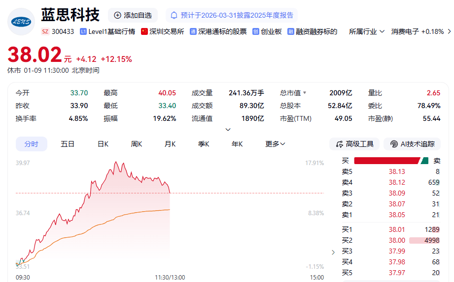 战略投资强脑科技,蓝思科技大涨超18%