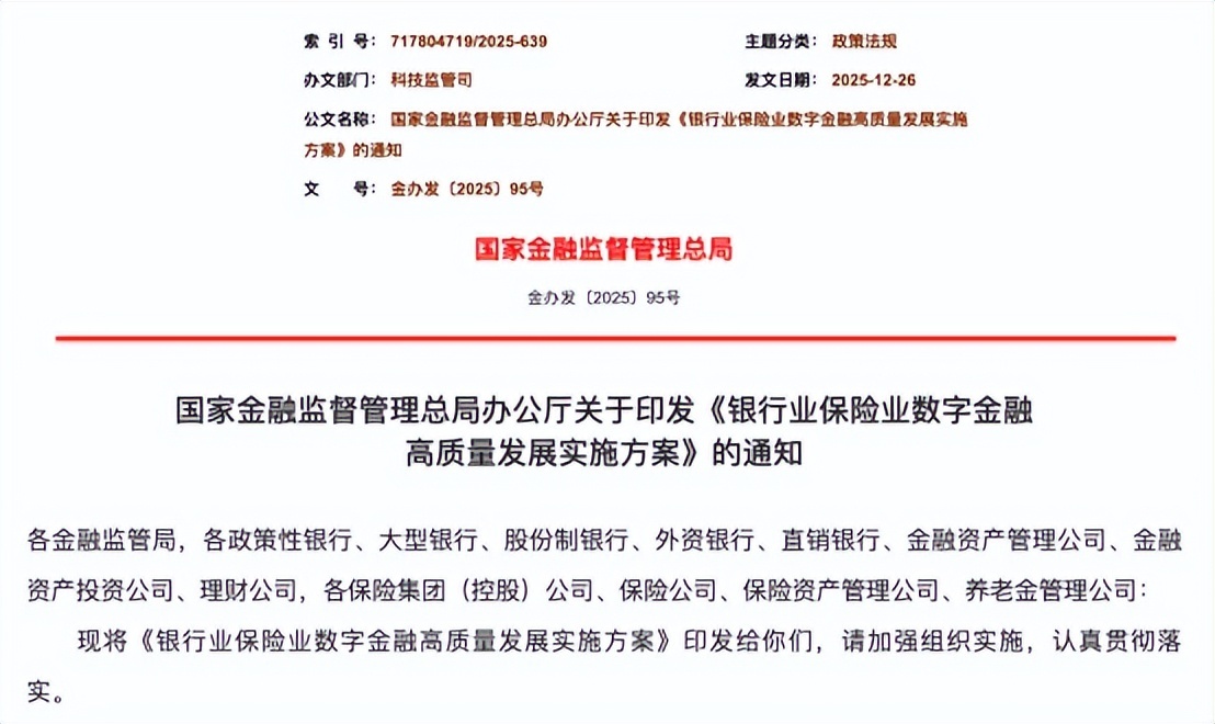 【环球网财经报道 记者 谭雅文】日前,国家金融监督管理总局发布《银行业保险业数字金融高质量发展实施方案》(以下简称《方案》),明确要充分发 挥人工智能等新技术创新引领作用,加快发展"人工智能+金融",探索前沿技术应用,加强科技研发能力建设,优化科技资源配置和投向,积极推进数字基 础设施建设,加强同业科技输出。 受访人士认为,从长远战略来看,《方案》将推动银行等金融机构重构业务流程,深度融合人工智能和数据要素。在市场竞争中,数字技术也有助于银行更 精准地定位目标客户,实现差异化发展。 政策引领:加快发展"人工智能+金融" 国家金融监督管理总局有关司局负责人介绍,《方案》在延续《关于银行业保险业数字化转型的指导意见》框架基础上,新增"人工智能+""数据要素×"等工 作内容,从健全治理机制、赋能金融服务、发挥新技术引领作用、激发数据要素潜能、强化风险防控、监管数字化智能化转型等六个方面提出具体工作要 求。 《方案》鼓励有条件的金融机构构建企业级人工智能平台,通过集中管理模型开发、部署与评估流程,提升人工智能建模及安全应用能力。同时积极探索量 子计算、区块链、隐私计算等前沿技术在金融场景的融合应用,实现科技创新成果加 ...