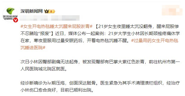 转自:综合 近日,我国冷空气依然活跃,又一轮雨雪降温到货。电热毯、暖手宝、暖气片等取暖神器再次成为冬日"小确幸"。但这些温暖的小帮手,有时也会成为"温 柔杀手",给皮肤带来容易被忽视的伤害——低温烫伤。 近日,媒体公布一起案例:21岁大学生小林因长期颈椎疼痛休学在家,寒夜里服用过量安眠药后,开着电热毯睡太沉,次日醒来后屁股淤青,确诊IV期压 疮。 对此,有网友质疑电热毯质量。 如果发现皮肤发红或有不适感,应立即用流动的冷水冲洗或凝胶性的产品冷敷降温处理;如遇到程度较为严重的低温烫伤,建议尽快前往医院治疗。 你冬天睡觉会使用取暖神器吗?在确认安全的情况下,你还有哪些保暖小妙招?评论区聊聊~ 综合学生健康报、新浪微博等 【未经授权,严禁转载!联系电话028-86968276】 那么,"低温烫伤"怎么预防呢?北京儿童医院顺义妇儿医院整形美容外科医生给出指导: 首先,要控制热源温度,使用电热毯、暖手宝等设备时,不要让其直接接触皮肤。其次,就是需要避免长时间接触热源,建议在睡觉前把电热毯打开,等被 窝暖和了就关掉电源再上床,避免整晚使用电热毯。再次,应注意皮肤感受,如果出现温度过高或不适,应立即移开热源,并检查皮肤状态 ...