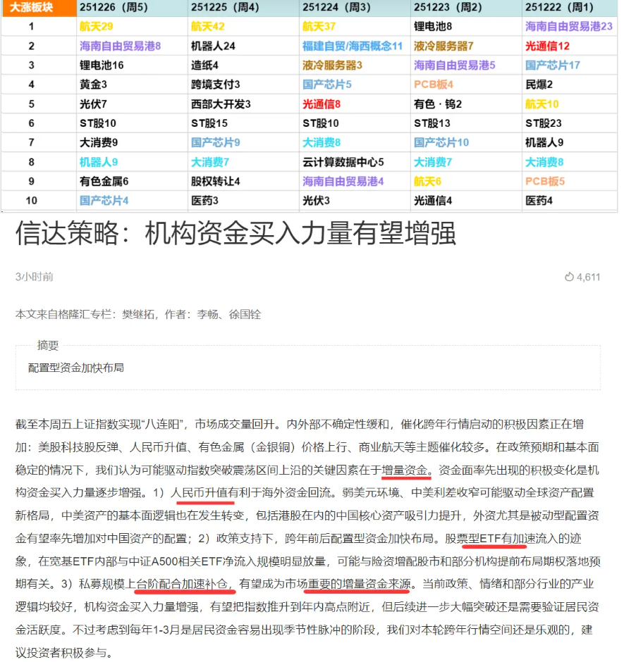 市场板块表现 - 在251222至251226的五个交易日内,航天、海南自由贸易港、锂电池、机器人、液冷服务器、光通信、国产芯片、ST股、大消费及有色金属等板块反复出现在涨幅前十榜单中,显示市场热点轮动但集中于科技、区域主题及部分周期板块 [1] - 具体来看,航天板块在251225(周四)位列涨幅第一,在251222(周一)和251223(周二)也进入前十 [1] - 海南自由贸易港概念在251222(周一)位列涨幅第一,并在后续三个交易日持续出现在榜单中 [1] - 锂电池板块在251224(周三)和251226(周五)分别位列涨幅第一和第三 [1] - ST股板块在五个交易日内持续上榜,显示其短期交易活跃 [1] 市场整体趋势与驱动因素 - 截至251226(周五),上证指数已实现“八连阳”,市场成交量回升,跨年行情启动的积极因素正在增加 [2] - 催化因素包括美股科技股反弹、人民币升值、有色金属(金银铜)价格上行以及商业航天等主题催化较多 [2] - 在政策预期和基本面稳定的背景下,驱动指数突破震荡区间的关键可能在于增量资金 [2] 增量资金分析 - 人民币升值有利于海外资金回流,弱美元环境及中美利差收窄可能驱动全球资产配置新格局,外资尤其是被动型配置资金有望增加对中国资产的配置 [2] - 政策支持下,跨年前后配置型资金加快布局,股票型ETF有加速流入迹象,宽基ETF内部与中证A500相关ETF净流入规模明显放量 [2] - 私募基金成为重要的增量资金来源,2025年10月私募基金证券管理规模环比大幅增加10400亿元,达到70076亿元,11月继续上升至70383亿元 [2][3] - 2025年10月私募基金仓位上升至66%,接近2008年以来平均水平,但后续因市场震荡,仓位下降4.9个百分点至61.3% [3] - 随着指数上涨和赚钱效应回升,私募基金加速补仓有望成为市场重要的增量资金来源 [2][3] 行情展望与路径 - 机构资金买入力量增强,有望把指数推升到年内高点附近,但后续进一步大幅突破需要验证居民资金活跃度 [2] - 考虑到每年1-3月是居民资金容易出现季节性脉冲的阶段,对跨年行情空间持乐观态度 [2] - 如果有盈利全面改善和资金流入共振,可能拉长牛市的时间 [4] - 未来牛市可能的节奏显示,行情演进需要更多居民资金入场、资深股民入场以及盈利全面改善等因素的配合 [5]