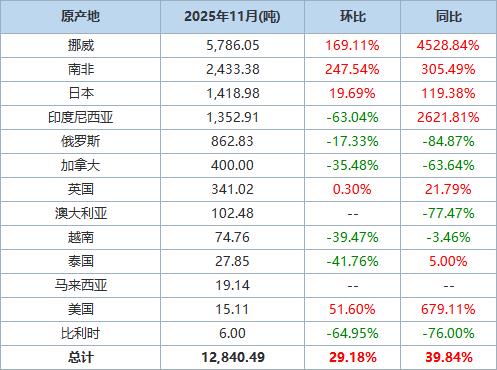 中国2025年11月未锻压镍进口总量分析 - 2025年11月中国未锻压镍进口总量为12,840.49吨 [1] - 进口总量环比2025年10月增长29.18% [1] - 进口总量同比2024年11月增长39.84% [1] 主要进口来源地分析 - 挪威为当月第一大进口来源地 进口量为5,786.05吨 [1] - 自挪威进口量环比增长169.11% 同比增长4528.84% [1] - 南非为当月第二大进口来源地 进口量为2,433.38吨 [1] - 自南非进口量环比增长247.54% 同比增长305.49% [1] 数据范围与定义说明 - 未锻压镍统计范围包括按重量计镍、钴总量≥99.99%且钴≤0.005%的未锻轧非合金镍 其他未锻轧非合金镍及未锻轧的镍合金 [1] - 进口总量数据中亦包含未在分项表中列出的部分原产地数据 [2] - 数据来源为中国海关总署 [3]
