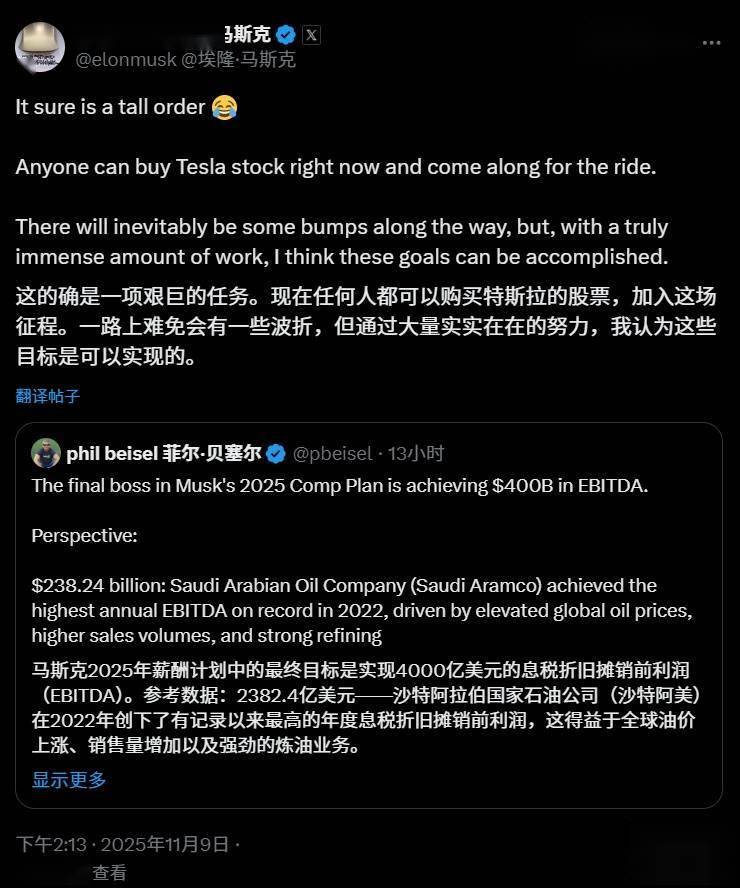马斯克对此表示:"这的确是一项艰巨的任务。现在任何人都可以购买特斯拉的股票,加入这场征程。一路上难免会有一些波折,但只要付出实打实的巨大 努力,我觉得这些目标都是能实现的。" IT之家 11 月 9 日消息,特斯拉 CEO 埃隆・马斯克称薪酬计划的目标"只要付出实打实的巨大努力都是能实现的"。 马斯克今日转发了一条贴文,其中提到:"马斯克 2025 年薪酬计划的'终极目标'是实现 4000 亿美元(IT之家注:现汇率约合 2.85 万亿元人民币)息税折旧 摊销前利润(EBITDA)。2382.4 亿美元 —— 这是沙特阿拉伯国家石油公司(沙特阿美)2022 年创下的史上最高年度 EBITDA。彼时受全球油价高企、销 量增长、地缘政治紧张及疫情后需求复苏推动,该公司炼油利润率表现强劲。这一数字远超埃克森美孚(2022 年为 1025.9 亿美元)、英伟达(2024 财年为 344.8 亿美元)等其他巨头企业。" 当地时间 11 月 6 日,马斯克一项为期 10 年的薪酬计划以超过 75% 的压倒性支持率获得股东大会投票批准。根据该计划,马斯克未来有望获得近 1 万亿美 元(现汇率约合 7.12 万亿元人民币)市 ...
