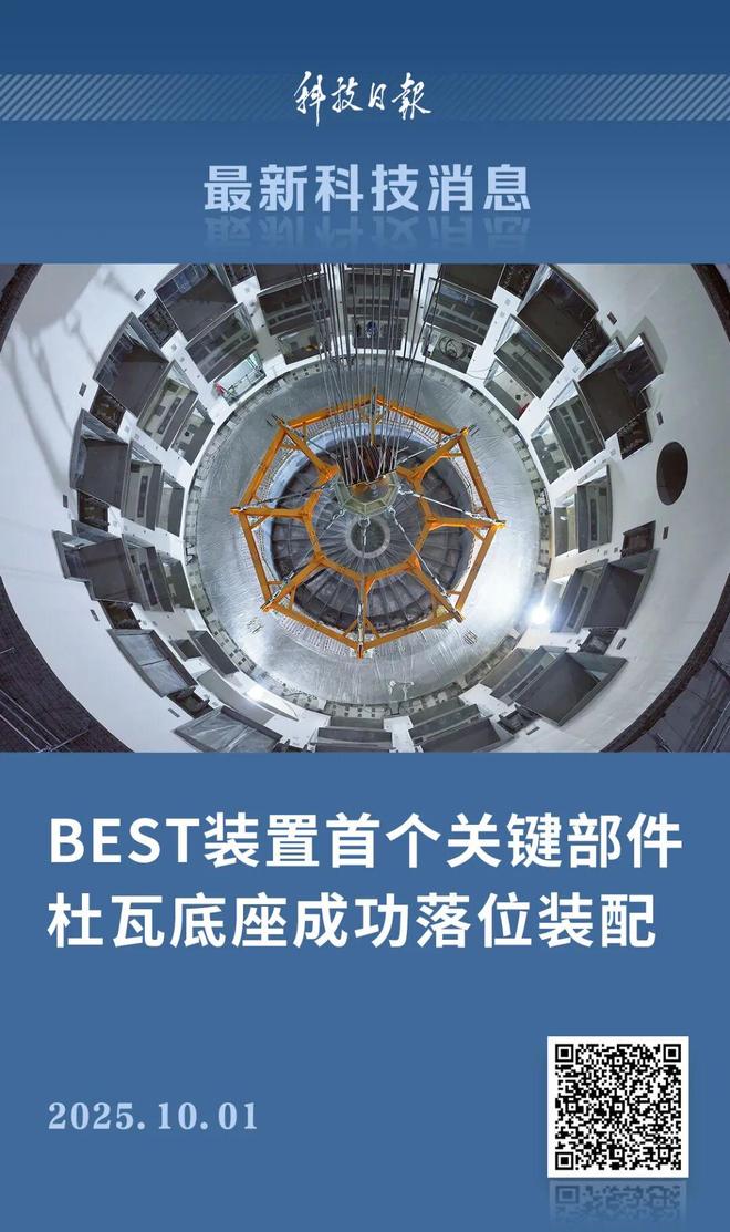 ◎ 科技日报记者 洪敬谱 10月1日,紧凑型聚变能实验装置(BEST)首个关键部件杜瓦底座成功落位装配仪式在安徽合肥举行, 标志着BEST项目建设取得关键性突破。 来源:科技日报 项目团队相继攻克了高精度成型和焊接、毫米级形变控制、高真空密封等关键技术,成功研制出杜瓦底 座部件。其制造交付和落位装配,为BEST装置后续核心部件的安装和调试奠定了坚实基础。 来源:科技日报 供图:中国科学院合肥物质科学研究院 海报制作:杨凯 王璠 杜瓦底座是BEST装置主机的首个真空大部件,设计工况复杂,接口数百个。结构尺寸大,直径约18 米,高度约5米,总重量400余吨,是BEST主机系统中最重的部件,也是国内聚变领域最大的真空部 件。该部件承载着BEST装置近七千吨重量支撑和绝热功能,其安装精度直接关系到整个工程的稳定性 和安全性。 ...