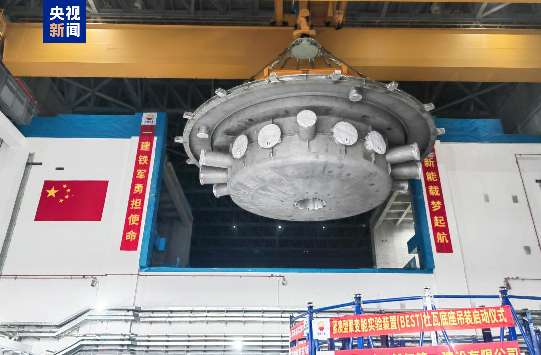9月27日,杜瓦底座在转运过程中。(受访单位提供) 安装如此庞然大物,需要极高的精度,从而确保装置未来的稳定性。表面水平高差需控制在15毫米以内,落位位置偏差不得超过正负2毫米,而落 位过程中底座与周围墙体间隙不足100毫米。项目团队通过自主研发专用吊具系统,并运用激光跟踪技术实时监测调整,最终实现了毫米级的精准 安装。 据介绍,杜瓦底座落位安装完毕后,主机核心部件将陆续进场安装。根据计划,BEST将于2027年底建成。该装置建设的稳步推进,对于我国率先 开展前沿聚变科学研究、验证未来聚变堆关键技术、持续引领国际聚变能发展具有重大战略意义。 10月1日上午,位于安徽合肥未来大科学城的紧凑型聚变能实验装置(BEST)建设现场传来好消息:该装置主机首个关键部件——杜瓦底座成功 落位安装,标志着项目主体工程建设步入新阶段,部件研制和工程安装开启"加速度"。 聚变能被誉为"终极能源",其原理是模拟太阳内部的核聚变反应,将轻元素聚合为重元素并释放巨大能量。区别于过去的核聚变实验装置,BEST 将实际演示氘、氚等离子体"燃烧",有望实现世界首次聚变能发电。今年5月该项目工程总装正式启动,因建设现场酷似科幻电影中的"行星发 ...