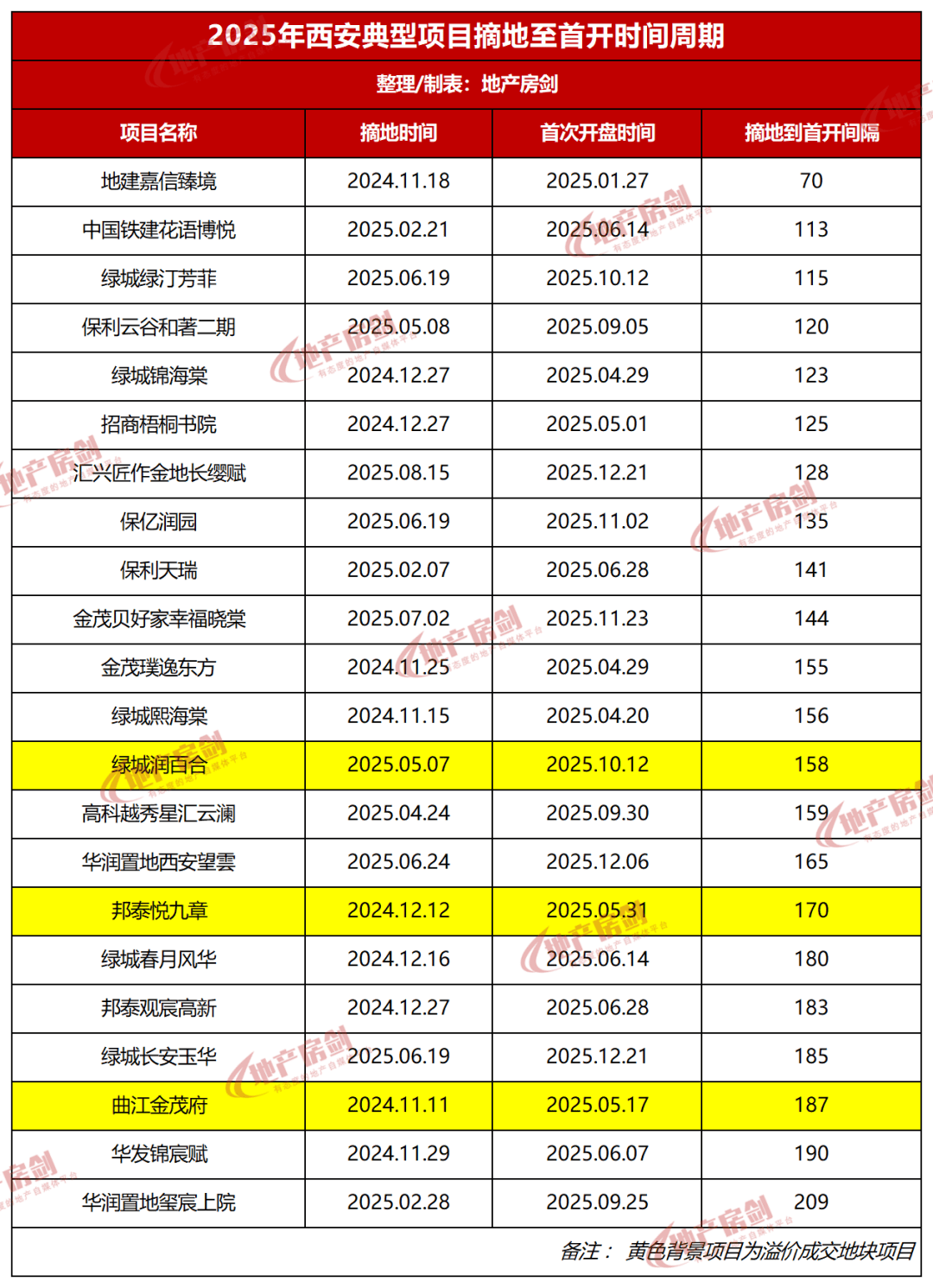文章核心观点 - 西安房地产市场开发速度显著加快,从拿地到开盘的周期不断缩短,已成为开发商比拼现金流效率和抢占市场先机的关键[1] - 开发商加速周转的核心驱动力在于提高资金使用效率与抢占新兴板块的市场需求,而支撑这种速度的因素包括定向拿地、预售政策调整、高效协作及标准化产品体系等[13][14][16] 2025年西安新项目开发速度现状 - 地产房剑统计的22个典型项目中,从拿地到首次开盘时间最短的三个项目为:地建嘉信臻境(70天)、中国铁建花语博悦(113天)、绿城绿汀芳菲(115天)[3][4] - 在22个楼盘中,有10个项目从拿地到首次开盘的时间在150天之内,即近一半项目在拿地5个月内开盘,其中6至7个项目实现了摘地4个月开盘[7] - 当前最快纪录由保利云谷和著一期保持,其在2024年从拿地到开盘仅用55天,而2023年入市的龙湖青云阙丨昱府周期为93天[5][6] 支撑高速度开发的关键因素 - 核心原因之一是地块属于定向挂牌,在摘地前项目规划已完成,个别项目甚至在摘地前已进场施工[8] - 预售政策的调整,部分区域预售条件降至非常低,进一步缩短了开发商从摘地到回笼资金的时间[9] - 即使在公开拍卖市场,项目速度也很快,例如绿城润百合(溢价拿地)从拿地到首开仅158天,邦泰悦九章和曲江金茂府(均为溢价成交)分别仅用170天和187天[11] - 高速度的实现依赖于当地的营商环境和效率、开发商自身的资金实力、以及内部与合作伙伴之间的高效协作[14] 高周转对开发商的意义与运作模式 - 加速开发首要目的是提高资金使用效率,早回笼资金可降低资金成本并加快资金滚动投入新项目,以10亿元土地款为例,按年化5%资金成本计算,每天成本约14万元[13] - 另一关键目的是抢占市场先机,特别是在新兴热点板块,率先入市的项目能捕获有限需求,后续项目在销售流速上难以匹敌,除非产品有碾压性优势[14] - 当前的高周转模式更强调对资源的最高效利用,而非过去依赖高杠杆与高额负债的模式,其支撑体系包括新技术应用、产品高度标准化、以及完善的产品体系、组织架构和人才体系[16] - 高周转主要集中于预售阶段,开盘后速度可能适当放缓,但通过将串行工作改为并行(如主体施工与外立面同步进行),从拿地到交付的整体周期也在缩短,例如招商揽阅鸿著、招商雲墨从拿地到交付仅2年,中粮悦著云轩为2.5年,短于此前普遍的3年周期[19]