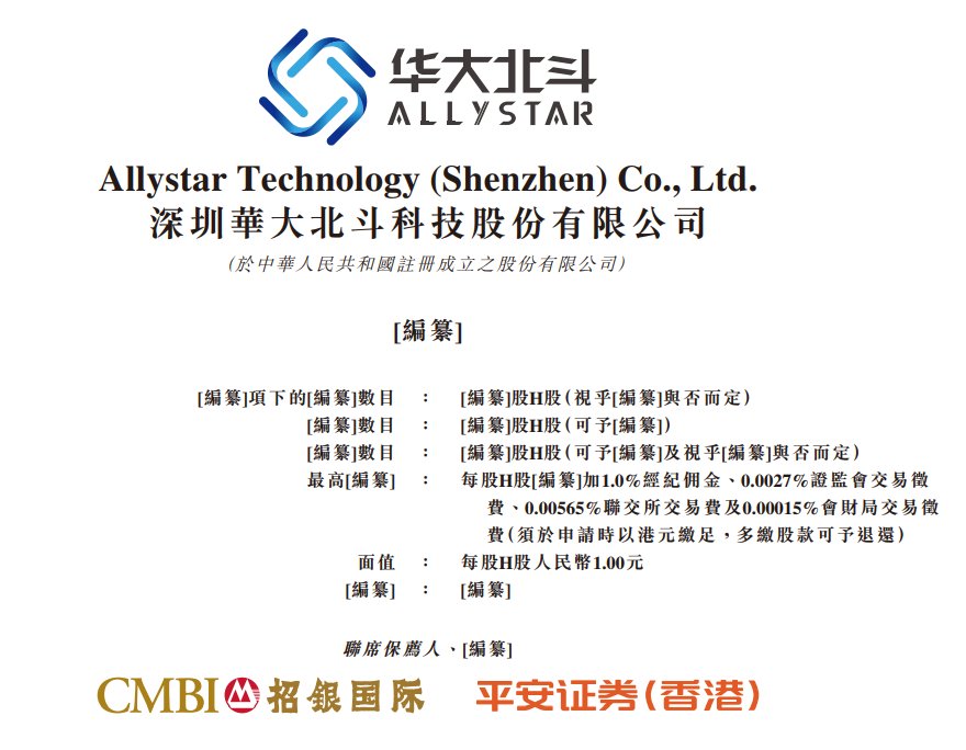 智通财经APP获悉,据港交所12月19日披露,深圳华大北斗科技股份有限公司(简称:华大北斗)向港交所主板提交上市申请,招银国际、平安证券(香港)为 其联席保荐人。该公司曾于2025年6月11日递表港交所。 | 编纂]項下的[编纂]數目 | : | [编纂]股H股(視乎[编纂]與否而定) | | --- | --- | --- | | [编纂]數目 | : | [编纂]股H股(可予[编纂]) | | [编纂]數目 | : | [編纂]股H股(可于[編纂]及視乎[編纂]與否而定) | | 最高[编纂] | : | 每股H股[编纂]加1.0%經紀佣金、0.0027%證監會交易徵 | | | | 費、0.00565%聯交所交易費及0.00015%會財局交易徵 | | | | 費(須於申請時以港元繳足,多繳股款可予退還) | | 面值 | : | 每股H股人民幣1.00元 | | [编纂] | : | 【编纂】 | 公司简介: 招股书显示,华大北斗是中国一家知名的空间定位服务提供商,总部位于深圳,提供支持北斗及其他主要GNSS的芯片、模组及相关解决方案。公司的研发 团队专攻GNSS技术领域,专注于一体化SoC芯片设计、 ...
