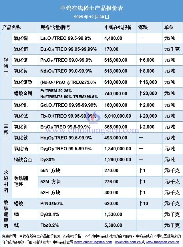 | | | 中钨在线稀土产品报价表 | | | | | --- | --- | --- | --- | --- | --- | | | | 2025年12月26日 | | | | | 产品名称 | | 规格/含量/牌号 | 中钨在线报价 | 涨跌 | 単位 | | | 氧化铜 | La2O3/TREO 99.5-99.9% | 4.400.00 | 1 | 元/吨 | | | 氧化镇 | Eu2O3/TREO 99.95-99.99% | 170.00 | I | 元/千克 | | を 稀 | 氧化错 | Pr6O11/TREO 99.0-99.9% | 610,000.00 | P | 九/吨 | | 士 | 氧化紋 | Nd2O3/TREO 99.0-99.9% | 605.000.00 | - | 元/吨 | | | 氧化错效 | (Nd2O3+Pr6O11)/TREO≥75.0% | 595,000.00 | 3,000 | 元/吨 | | | 错效金属 | Pr/TREM 20-25% | 725.000.00 | | 元/吨 | | | | Nd/TREM75-80% TREM298.5% | | ...