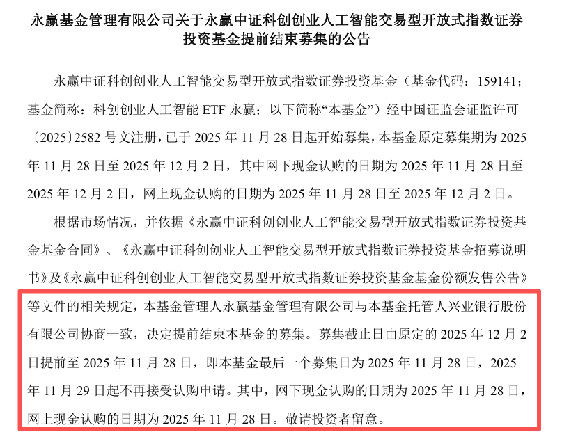 产品发行与市场反应 - 永赢中证科创创业人工智能ETF成为全市场首只“双创人工智能ETF”并提前结束募集,原定3天募集期缩短至1天,实现“一日售罄” [2][6] - 该ETF认购规模已超过9亿元,接近其首次募集规模上限10亿元 [2][6] - 11月28日,首批7只科创创业人工智能ETF集体发行,除永赢基金外,还包括易方达、华泰柏瑞、景顺长城、鹏华、摩根、工银瑞信等基金公司旗下产品 [6][7] 行业趋势与指数表现 - 中证科创创业人工智能指数年内涨幅超过85%,表现优于科创创业50指数、双创100指数等同类指数 [8] - 全球某AI龙头企业第三季度营收与每股收益超预期,对第四季度的营收指引也高于市场预期,显示全球AI算力需求旺盛 [8] - 国内AI产业链各环节加速跟进,从算力基础设施到应用落地均呈现积极进展 [2][8] 指数特点与投资价值 - 中证科创创业人工智能指数同时涵盖科创板与创业板公司,兼具科创板企业重视研发投入的技术特质和创业板公司较强的商业化能力 [9] - 指数成份股研发强度与科创AI指数接近,营收增长表现则与创业板人工智能指数相当,具备高研发、高成长的双重特质 [9] - 在全球视野下,中国人工智能产业展现出显著投资价值,东亚市场凭借其在全球半导体、芯片及人工智能供应链中的关键地位持续受到资本关注 [8]