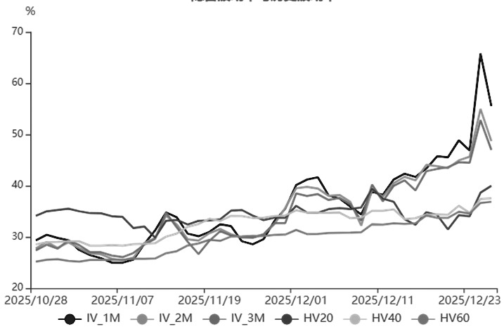 惊现100%分位值 面对沪银期权的史诗级高波动率,投资者可基于对沪银期货行情的预判,匹配相应的期权策略。宏观或地缘事件往 往推动贵金属等相关品种期权波动率短期内大幅波动。通过把握波动率均值回归特征,可系统构建期权交易策略。 上周贵金属期货集体冲高,沪银期权隐含波动率创历史新高,一度飙升至65%以上,历史分位值一度抵达100%, 市场短期对沪银价格波动的预期较高。 图为沪银期权隐含波动率(IV)与历史波动率(HV)走势 截至2025年12月26日,平值认购期权(沪银2602C17200)收于1956,上涨55.05%;平值认沽期权(沪银 2602P17200)收于848.5,下跌33.53%。截至2025年12月26日,期权合约总成交607227张,较上一交易日减少 308.93%,总持仓344794张,较上一交易日增加12.36%,成交持仓比176.11%。期权成交量认沽认购比68.51%,持 仓量认沽认购比162.02%。截至2025年12月26日,标的20日、40日、60日和120日历史波动率分别为42.42%、 39.29%、38.29%和30.36%。Ⅳ_1M、Ⅳ_2M、Ⅳ_3M和Ⅳ_6M期权隐含波动 ...