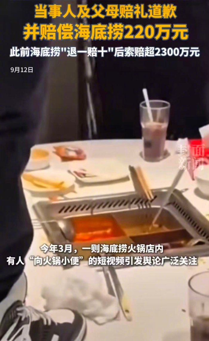 来源:浙江新闻 今天(22日)人民法院报刊登《孩子餐厅"撒野",家长被判赔220万!》,深度解析此前轰动一时的海 底捞"小便门"案件。全文如下↓ 孩子餐厅"撒野",家长被判赔220万! 上海黄浦区法院: 兼顾企业商誉维护与未成年人教育矫正 凌晨的火锅店包间内,两名17岁男生为寻求刺激往火锅里小便,还拍摄视频发到网上,一时间掀起巨大 舆论风浪,让知名餐饮品牌海底捞陷入商誉危机。 近日,上海市黄浦区人民法院审结了这起轰动一时的名誉权及财产损害赔偿纠纷案,判令两名未成年人 及其监护人向海底捞公司公开赔礼道歉,监护人赔偿海底捞公司经济损失220万元。 这份判决不仅清晰认定侵权责任,为无形的"商誉损失"算了一笔细账,依法保护了企业商誉,更在处理 未成年人侵权方面做出了大胆探索,准确划分未成年人及其监护人应承担的侵权责任,通过让未成年人 承担非财产性责任的方式,实现教育矫正的目的。 未成年人包间滋事引发企业危机 餐饮企业为护商誉起诉要求赔偿 四川新某餐饮管理集团有限公司(以下简称海底捞总公司)是海底捞品牌国内餐饮业务的核心运营主 体,不仅经授权使用海底捞商标,还实际控制上海捞某餐饮管理有限公司(以下简称海底捞上海公司) ...