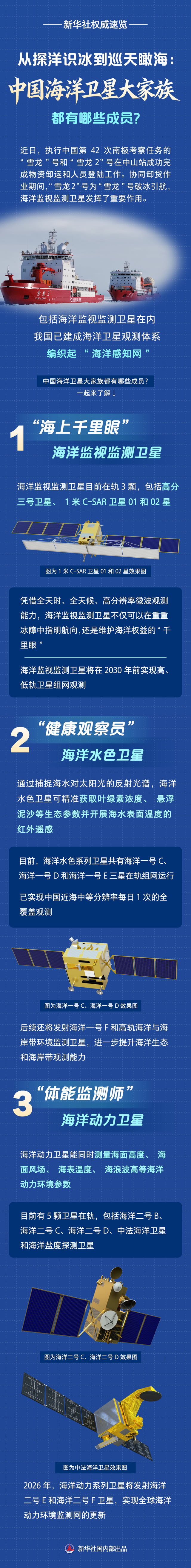 转自:北京日报客户端 包括海洋监视监测卫星在内 我国已建成海洋卫星观测体系 编织起"海洋感知网" 中国海洋卫星大家族都有哪些成员? 起来了解↓ "健康观察员" 海洋水色卫星 通过捕捉海水对太阳光的反射光谱, 海洋 水色卫星可精准获取叶绿素浓度、 悬浮 泥沙等生态参数并开展海水表面温度的 红外遥感 目前,海洋水色系列卫星共有海洋一号 C、 海洋一号 D 和海洋一号 E 三星在轨组网运行 已实现中国近海中等分辨率每日 1 次的全 覆盖观测 "海上千里眼" 海洋监视监测卫星 海洋监视监测卫星目前在轨3颗,包括高分 号卫星、1 米 C-SAR 卫星 01 和 02 星 图为 1 米 C-SAR 卫星 01 和 02 星效果图 凭借全天时、全天候、高分辨率微波观测 能力,海洋监视监测卫星不仅可以在重重 冰障中指明航向,还是维护海洋权益的" 千 里眼" 海洋监视监测卫星将在 2030 年前实现高、 低轨卫星组网观测 海报制 来源:新华社 作者: 刘祯 顾天成 图为海洋一号 C、海洋一号 D 效果图 后续还将发射海洋一号 F 和高轨海洋与海 岸带环境监测卫星,进一步提升海洋生态 和海岸带观测能力 "体能监测师" 海洋动力卫 ...