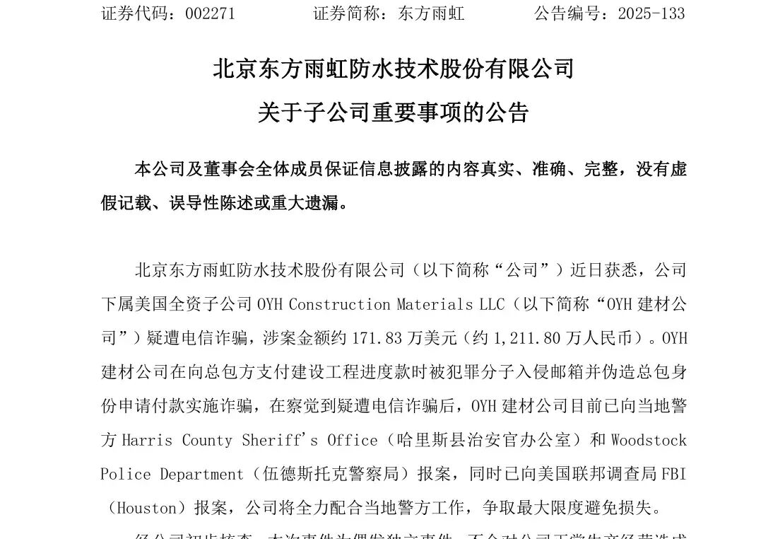 过去提起电信诈骗,大家的第一反应多半是"专骗老年人的小把戏"。 谁也没料到,如今连市值超300亿的上市公司都能沦为诈骗分子的"提款机",还稀里糊涂地把1200多万真金白银转了出去。 01 上市公司也遭电诈,海外项目付款遭遇邮箱入侵 2025年12月23号晚上,市值超322亿的防水建材龙头东方雨虹发了个公告。 内容直白明了,其美国全资子公司OYH建材公司,疑似遭遇了电信诈骗。 涉案金额不算小,约171.83万美元,换算成人民币差不多1211.8万元。 具体怎么被骗的呢? 公告里说,OYH建材公司本来要给工程总包方付建设进度款,结果犯罪分子入侵了他们的邮箱,还冒充总包方的身份申请付款,就这么把钱骗走了。 来源:东方雨虹公告 发现不对劲后,子公司立马就报案了,不仅找了美国当地的哈里斯县治安官办公室、伍德斯托克警察局,还向休斯顿的FBI报了案。 东方雨虹也表态,会全力配合警方调查,尽量减少损失。 公告里还特意提了一句,说这事儿是偶然发生的独立事件,不会对公司正常生产经营造成大的不利影响。 对于案件目前的进展等核心问题,凤凰网财经《公司研究院》联系了东方雨虹方面,截至发稿时仍未收到回复。 这则公告一出,股吧里直接炸了锅 ...