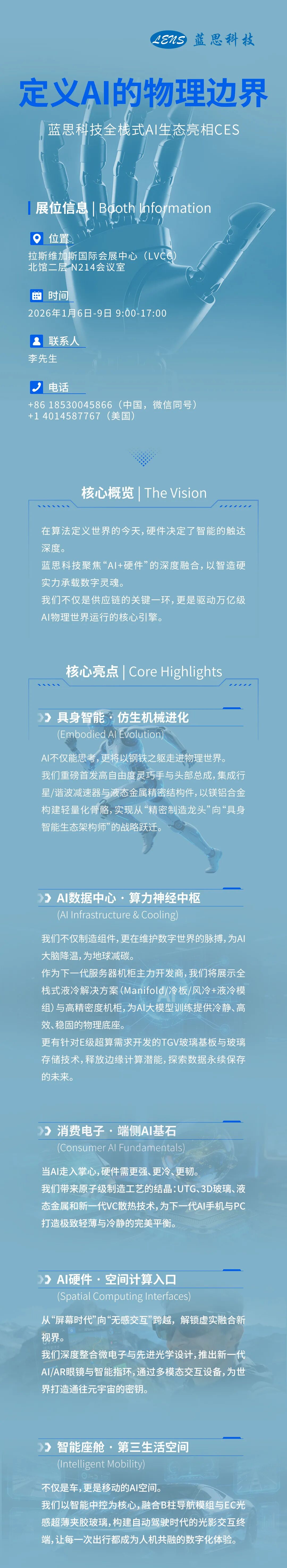 公司战略定位 - 公司聚焦“AI+硬件”深度融合 以智能制造承载数字灵魂 不仅是供应链关键一环 更是驱动万亿级AI物理世界运行的核心引擎 [4] - 公司正实现从“精密制造龙头”向“具身智能生态架构师”的战略跃迁 [5] 具身智能产品 - 公司重磅首发高自由度灵巧手与头部总成 集成行星/谐波减速器与液态金属精密结构件 [5] - 产品采用镁铝合金构建轻量化骨骼 [5] AI数据中心与算力基础设施 - 公司作为下一代服务器机柜主力开发商 展示全栈式液冷解决方案 包括Manifold、冷板、风冷+液冷模组与高精密度机柜 [6] - 相关技术为AI大模型训练提供物理底座 旨在实现冷静、高效、稳固的运行 [6] - 公司针对E级超算需求开发了TGV玻璃基板与玻璃存储技术 以释放边缘计算潜能并探索数据永续保存 [6] 消费电子与端侧AI - 公司为下一代AI手机与PC提供关键材料与技术 包括采用原子级制造工艺的UTG、3D玻璃、液态金属和新一代VC散热技术 [7] - 相关技术旨在实现设备的极致轻薄与冷静运行的完美平衡 [7] 活动信息 - 公司全栈式AI生态在2026年CES展亮相 展会时间为2026年1月6日至9日 [2][3] - 展位位于拉斯维加斯国际会展中心北馆二层N214会议室 [3]