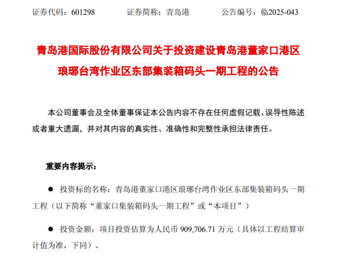 12月19日晚间,青岛港(601298)发布公告,宣布拟合计投资157亿元,在董家口港区推进两大码头工程建设,分别为琅琊台湾作业区东部集装箱码头一 期工程与湾底通用码头工程,两大项目均预计2029年建成,建设周期均为4年。 其中,东部集装箱码头一期工程投资估算达90.97亿元。该项目选址于董家口港区琅琊台湾东岸规划集装箱泊位区北端湾底通用码头7号泊位南侧,将建设 3个集装箱专业化泊位,包括1个7万吨级、1个10万吨级和1个15万吨级泊位,码头岸线总长1167米,堆场用海总面积125.97公顷,设计年通过能力320万 TEU(标准箱),码头及堆场均按全自动化标准打造。 项目资金来源为公司自有或自筹资金,将通过新增专业化集装箱码头,与前湾港区现有码头升级改造形成合力,有效提升集装箱作业能力,更好地满足集 装箱国际中转及腹地货物运输增长需求。 另一项湾底通用码头工程投资估算为66.15亿元,资金来源同样为自有或自筹。项目位于董家口港区琅琊台湾作业区湾底北侧及东侧岸线,将建设7个3万 吨—7万吨级通用泊位,其中北侧岸线布局4个3万吨级泊位,东侧岸线建设2个4万吨级泊位及1个7万吨级泊位,码头岸线长度1668米,陆域总 ...
