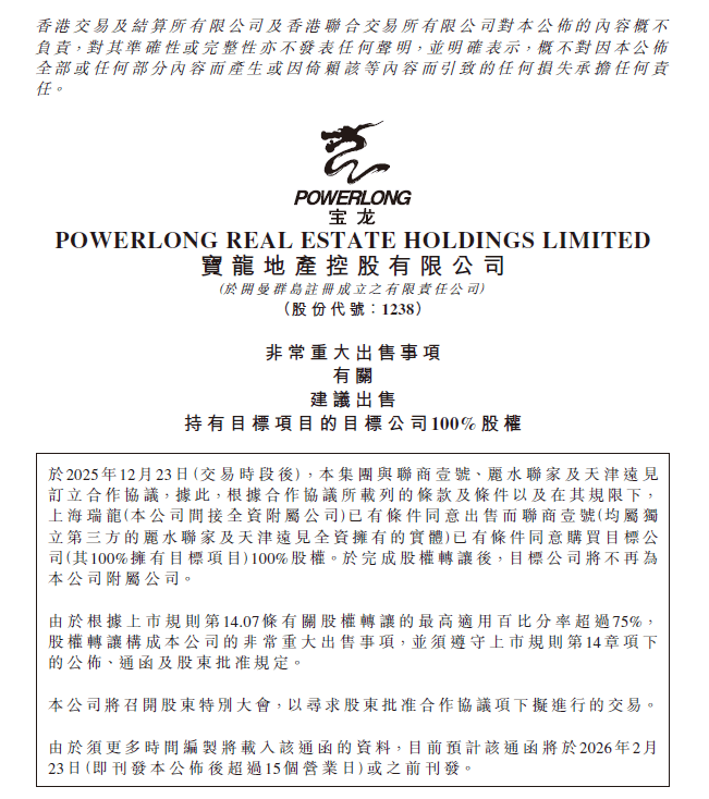 交易概述 - 宝龙地产通过其间接全资附属公司上海瑞龙 向联商壹号转让杭州华展房地产开发有限公司100%股权 从而出售滨江宝龙城商业综合体 [1][4] - 交易初步代价为人民币10亿元 此价格为股权交易价 包含了目标公司的债务及现金 [6] - 滨江宝龙城协定总资产价值为24.5亿元 负债14.6亿元 账户现金1000万元 整体转让价24.6亿元 [6] 交易细节 - 交易标的资产包括购物中心和艺珺酒店 不涉及写字楼滨江宝龙中心 [6] - 交易完成后 滨江宝龙城仍由宝龙商业运管管理 且宝龙地产对标的资产拥有优先回购权 [6] - 买方联商壹号由丽水联家及天津远见全资拥有 其背后大股东为中国财政部持有的保险公司 [4] 公司财务状况与影响 - 出售滨江宝龙城有助于宝龙地产将优质资产变现 对解决其流动性危机有积极作用 [9] - 滨江宝龙城为优质资产 2024年销售额超33亿元 业绩跻身杭州商业综合体前列 [9] - 宝龙地产债务重组取得关键进展 占计划债务总额85.48%的债权人已递交加入重组支持协议的函件 [8] - 香港高等法院已排定2026年3月19日就重组方案进行聆讯 [8][9]