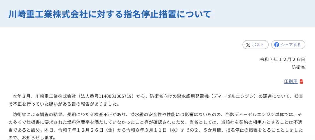 【#日本军工巨头造假#】#日本军工造假超30年#据参考消息,日本《朝日新闻》12月27日报道,日本防 卫省于26日宣布,因川崎重工业公司伪造日本海上自卫队潜艇发动机燃油效率检验数据,暂停该公司参 与竞标两个半月,自当日起至明年3月11日止。日本海上自卫队有25艘潜艇,全部使用川崎重工业生产 的发动机。川崎重工业还生产巡逻机和运输机。对于一家在军工行业中扮演核心角色的公司而言,被暂 停竞标实属罕见。据防卫省和川崎重工业发布的消息,川崎重工业在陆地测试潜艇发动机燃油效率时, 篡改了数据,因为实测数据不符合交付要求。这种欺诈行为从1988年持续到2021年,涉及发动机数量66 台,相当于33艘潜艇使用的发动机数量。防卫省承认,这是一起"长期、系统性的欺诈行为",但并未对 作战行动或安全造成影响。根据防卫省装备厅2024财年的采购报告,川崎重工业的合同金额高达6383亿 日元(约合41亿美元),位居第二。如果该公司被暂停投标资格,在不影响自卫队行动的情况下,它将无 法参与防卫省接下来的采购项目投标。防卫省也在考虑要求川崎重工业返还相当于违约金额的款项。与 此同时,川崎重工业于26日公布了由第三方律师牵头的特别调查委员 ...