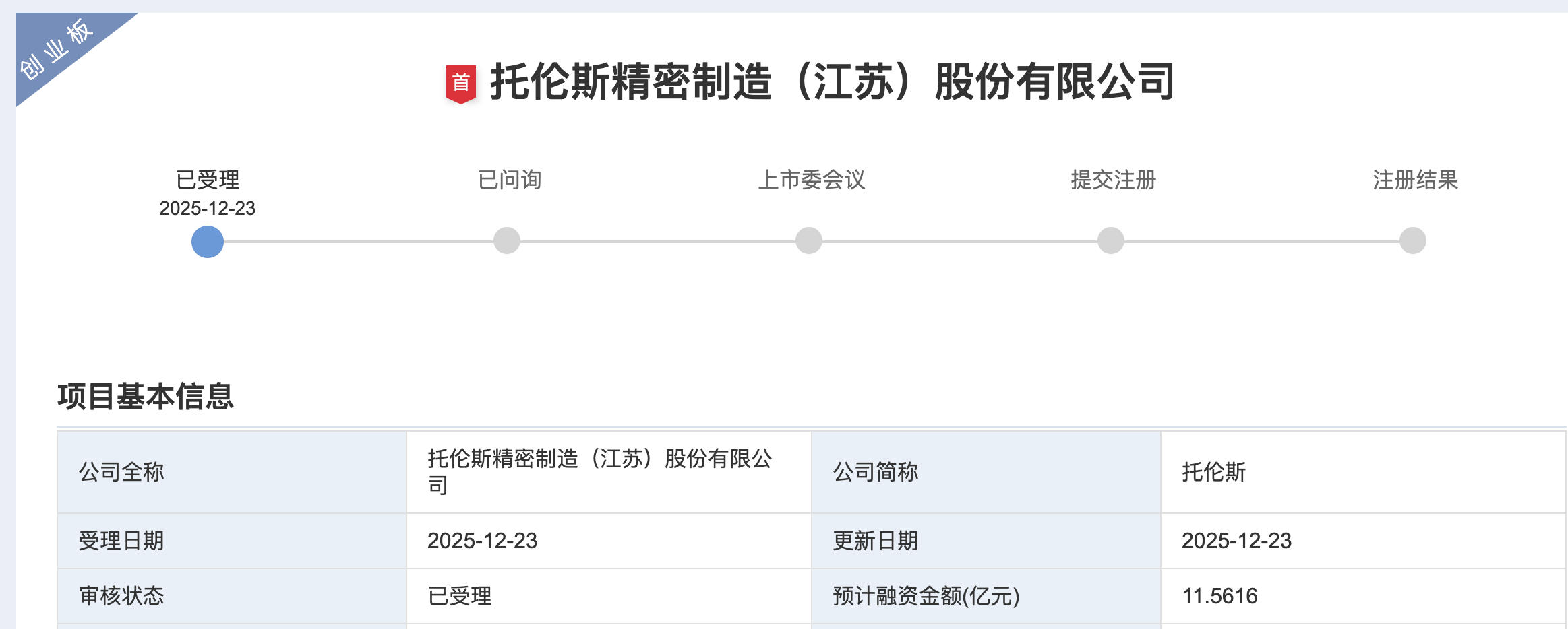 公司IPO与募资计划 - 托伦斯精密制造(江苏)股份有限公司创业板IPO申请已于2025年12月23日获深交所受理 [1][2] - 公司计划募集资金总额为11.56亿元人民币 [1][4] 公司业务与产品定位 - 公司是国内领先的精密金属零部件研发、生产和销售综合服务商,致力于为半导体设备提供高性能关键零部件 [2] - 产品包括关键工艺零部件、工艺零部件、结构零部件、气体管路及系统组装产品等 [2] - 在半导体关键工艺零部件领域,公司已量产腔体、内衬、加热器、匀气盘等产品,并成功实现冷盘、多管式加热反射罩、气体分布盘、静电卡盘基体等复杂结构零部件的生产 [2] - 公司工艺能力同时覆盖激光设备领域,可提供高功率激光器所需的激光器腔体和冷却工艺零部件产品 [2] 技术与工艺能力 - 公司整体工艺水平位居国内厂商第一梯队 [3] - 核心技术全面覆盖高精度机械制造、焊接及表面处理三大领域,并形成了复杂精密零部件工艺整合与检测能力 [3] 客户与市场应用 - 公司深度服务本土半导体设备厂商,产品已进入北方华创、中微公司等客户的供应体系 [3] - 产品应用于刻蚀设备、薄膜沉积设备、抛光设备、退火设备等核心设备,覆盖逻辑芯片、存储芯片工艺设备及先进封装等领域 [3] - 公司已成功导入国际知名激光设备企业Lumentum的供应链 [3] 财务业绩与成长性 - 2022年至2025年上半年,公司主营业务收入分别为2.79亿元、2.87亿元、6.06亿元和3.7亿元 [3] - 同期净利润分别为3394.53万元、1530.47万元、1.06亿元和6085.23万元 [3] - 最近3年主营业务收入和净利润的复合年增长率分别约为47.37%和76.31% [3] - 在半导体国产化替代加速及精密零部件需求提升的背景下,公司业务整体保持增长,具有较好的成长性 [3] 募投项目规划 - 本次募集资金将投资于“托伦斯精密零部件制造及研发基地项目”及补充流动资金 [4] - 募投项目符合国家产业政策和公司发展战略,有助于巩固并提升公司在半导体精密零部件行业的市场地位 [4] - 通过项目实施,公司将加大新技术和新产品的研发投入与产线布局,以提高创新能力和核心竞争力 [4]