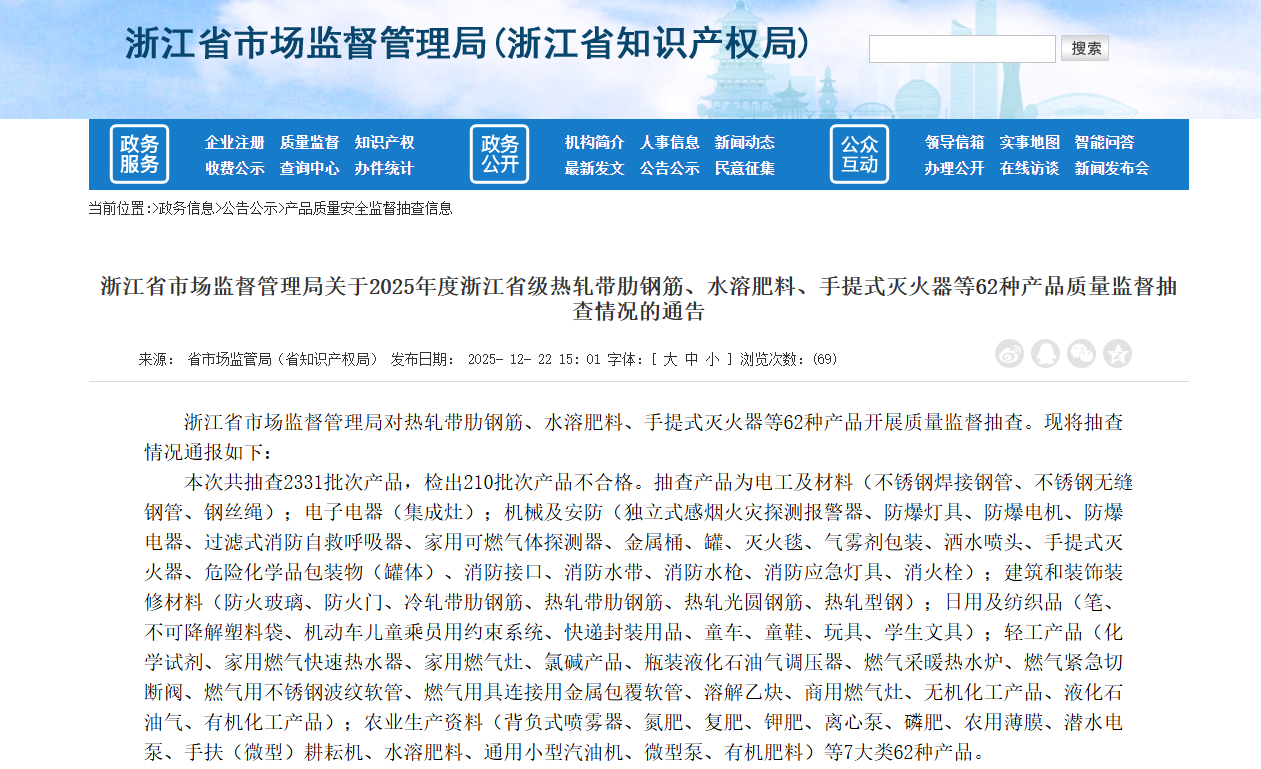 浙江省市场监督管理局发布2025年度浙江省级热轧带肋钢筋、水溶肥料、手提式灭火器等62种产品质量监督抽查情况通告