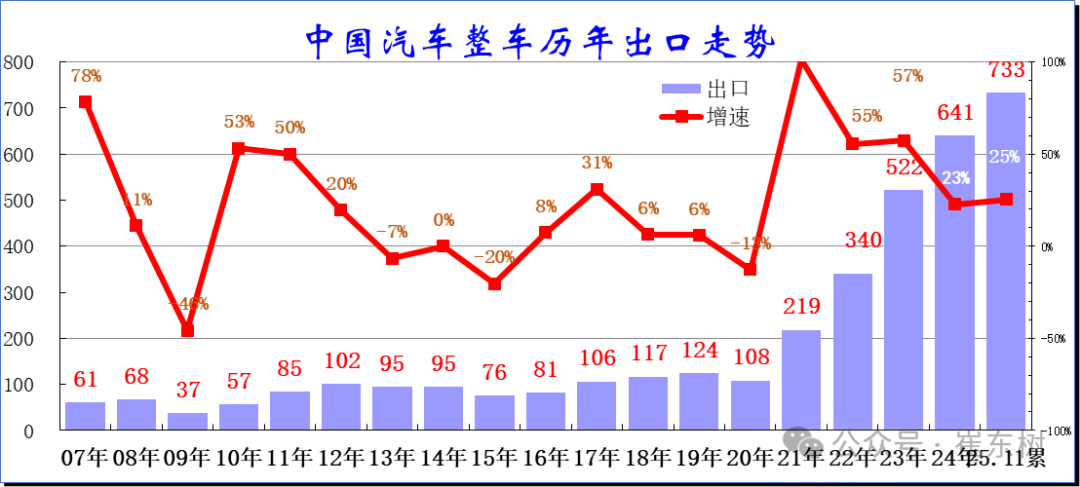 智通财经APP获悉,乘联会秘书长崔东树发文称,2025年11月中国汽车实现出口81万辆,同比增48%,环比降2%,1-11月中国汽车实现出口733万辆,同 比2024年1-11月增速25%,总体较强。2025年11月中国新能源汽车出口35万辆,同比增长156%,表现很好;2025年1 - 11月新能源汽车出口量301万辆,同比 增长62%,增速近期超高。 2025年11月中国汽车出口总量的前10国家:墨西哥90212辆、俄罗斯61881辆、阿联酋53114辆、巴西29231辆、澳大利亚26121辆、英国24441辆、阿尔及利 亚21532辆、吉尔吉斯斯坦21372辆、印度尼西亚20915辆、哈萨克斯坦20213辆,其中本期较同期增量增大的前五个是:墨西哥54705辆、阿联酋22877辆、 阿尔及利亚19213辆、巴西18620辆、澳大利亚13252辆。俄罗斯市场中国车企防风险意识提升,虽然1-11月俄罗斯国内销量下滑不大,但2025年1-11月对 俄罗斯的出口下降幅度较大。2025年累计整车出口总量的前10国家:墨西哥573453辆、俄罗斯513078辆、阿联酋465539辆、巴西285122辆、英国2807 ...