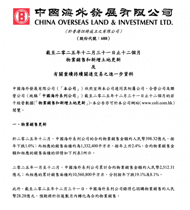 来源:环球网 【环球网综合报道】1 月 7 日,中国海外发展有限公司发布公告,披露其2025年12月及全年物业销售和 新增土地数据。 公告显示,于2025年12月,中国海外系列公司的合约物业销售金额约398.32亿元(人民币,下同),按 年下跌1.0%;相应的销售面积约为133.24万平方米,按年上升2.4%。 2025年1月—12月,中国海外系列公司累计合约物业销售金额约2512.31亿元,相应的累计销售面积约 1056.08 万平方米,分别按年下跌19.1%及8.1%。 此外,截至2025年12月31日,中国海外系列公司录得已认购物业销售约28.28亿元,预期将于往后数月 内转化为合约物业销售。 公告还披露,2025年12月,中国海外发展新增土地涵盖长沙、深圳及北京三幅地块,权益建筑面积约 21.29万平方米,权益地价约44.06亿元。2025年1月-12月,新增土地累计权益建筑面积约444.55万平方 米,累计权益地价约924.23亿元。 此外,2025年12月,中国海外宏洋集团新增土地涵盖宁夏回族自治区银川市、安徽省合肥市、山东省济 宁市、福建省泉州市及甘肃省兰州市五幅地块,权益建筑面积约75.82万 ...