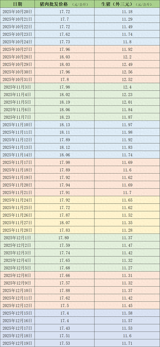 据农业农村部监测,12月19日,全国农产品批发市场猪肉平均价格为17.53元/公斤,与上周五(12月12 日)的17.5元/公斤相比,上涨0.2%。本周的平均价格为17.45元/公斤,与上周17.65元/公斤的均价相 比,下降1.1%。 本周国内生猪价格呈震荡上涨走势,周均价环比上涨。据中国养猪网的数据,12月19日,生猪(外三 元)价格为11.71元/公斤,与上周五(12月12日)的11.45元/公斤相比,上涨2.3%。从一周均价来看, 本周生猪均价为11.6元/公斤,与上周11.37元/公斤的均价相比,上涨2%。 卓创资讯预计未来一周全国行情或呈涨势收窄而后震荡回落的态势。供应方面,未来一周养殖端生猪出 栏量或继续增加,部分养殖场或开始进入年底冲刺出栏任务阶段,生猪供应或较为充足,利空行情。需 求方面,冬至过后北方需求高峰或陆续结束,屠宰量不乏冲高回落可能。而南方部分区域需求仍有增加 可能。 近期的猪肉和生猪价格。制表 智通财经 本周全国生猪交易均重微涨。卓创资讯监测全国生猪平均交易体重为124.79公斤,环比小涨0.15%。本 周分省份交易均重有涨有降。体重下滑省份以北方为主,主因为前期猪病导致部分猪源 ...