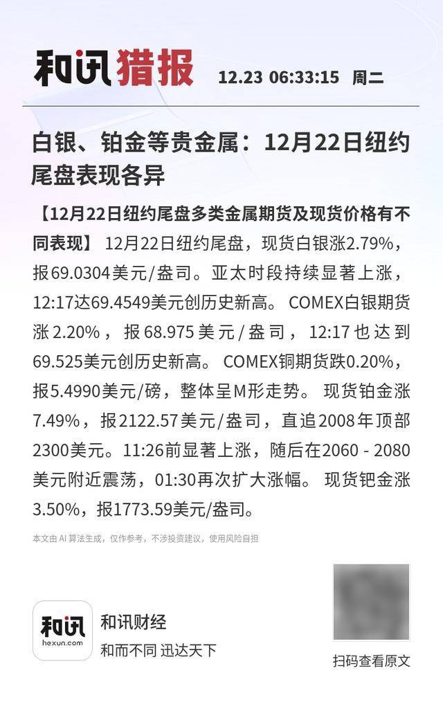 【12月22日纽约尾盘多类金属期货及现货价格有不同表现】12月22日纽约尾盘,现货白银涨2.79%,报 69.0304美元/盎司。亚太时段持续显著上涨,12:17达69.4549美元创历史新高。COMEX白银期货涨 2.20%,报68.975美元/盎司,12:17也达到69.525美元创历史新高。COMEX铜期货跌0.20%,报5.4990美 元/磅,整体呈M形走势。现货铂金涨7.49%,报2122.57美元/盎司,直追2008年顶部2300美元。11:26前 显著上涨,随后在2060 - 2080美元附近震荡,01:30再次扩大涨幅。现货钯金涨3.50%,报1773.59美元/ 盎司。 本文由 AI算法生成,仅作参考,不涉投资建议,使用风险自担 和讯猎报 12.23 06:33:15 周二 和讯财经 和而不同 迅达天下 扫码查看原文 白银、铂金等贵金属:12月22日纽约 尾盘表现各异 【12月22日纽约尾盘多类金属期货及现货价格有不 同表现】 12月22日纽约尾盘,现货白银涨2.79%, 报69.0304美元/盎司。亚太时段持续显著上涨, 12:17达69.4549美元创历史新高。COMEX白银期货 涨2. ...