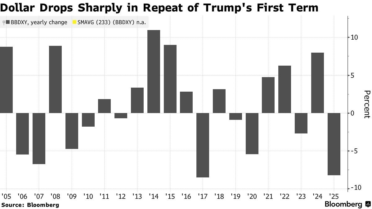 来源:市场资讯 来源:国际金融报 2025年,美元经历了一场"滑铁卢"。 衡量美元对一篮子主要货币汇率的美元指数,在年内暴跌约9%,正迈向自2017年以来最差的年度表 现。 截至12月23日记者发稿,美元指数跌破98,创5日新低。 此外,美国内部迎来更严峻的挑战。随着美国创纪录的财政赤字和政府债务规模引发广泛担忧,国际评 级机构已下调美国政府信用评级。政府信用是主权货币的基石,其动摇直接冲击了市场对美元币值稳定 的信心。 市场还担忧政治因素可能影响美联储货币政策的独立性,特别是2026年美联储领导层可能更迭为鸽派人 选,这或引发更激进的宽松预期,从而利空美元。 在美元"跌跌不休"的同时,非美货币普遍走强。欧元兑美元升值约14%,瑞士法郎和瑞典克朗兑美元分 别上涨14.5%和19%。多个新兴市场货币也表现强劲。 与此同时,黄金作为传统避险资产大放异彩。现货金价年内飙升近68%,各国央行持续购金成为趋势。 继续下跌 市场对美联储持续降息的预期、美国与其他主要经济体利差快速缩小,以及对美国巨额财政赤字和政治 不确定性的担忧共同造成了今年美元的下跌走势。 展望明年,市场的悲观情绪并未消散。多家机构认为,2026年,美 ...