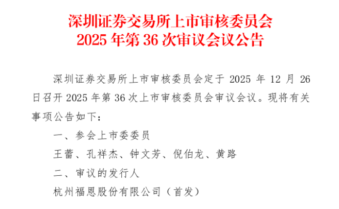公司上市进程 - 福恩股份主板IPO将于12月26日上会迎考 [1] - 公司IPO于2025年6月24日获得受理 并于7月9日进入问询阶段 [1] 公司业务与定位 - 福恩股份是一家以可持续发展为核心的全球生态环保面料供应商 [1] - 公司主营业务为生态环保面料的研发、生产和销售 [1] 募资计划与用途 - 福恩股份拟募集资金约12.5亿元 [1] - 募集资金扣除发行费用后 将用于萧政工出(2023)82号再生环保毛型色纺面料一体化项目 [1] - 募集资金还将用于高档环保再生材料研究院及绿色智造项目 [1]