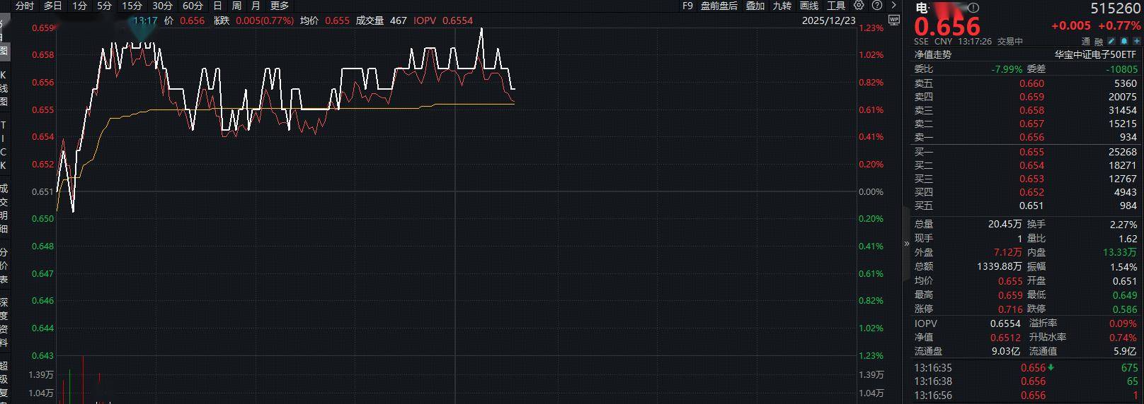 炒股就看金麒麟分析师研报,权威,专业,及时,全面,助您挖掘潜力主题机会! 12月23日,电子ETF(515260)盘中表现稳健,场内涨幅盘中上探1.23%,现涨0.77%。 成份股方面,北方华创、工业富联和胜宏科技表现最为突出,涨幅分别达到4.72%、4.11%和3.64%。另 一方面,领益智造、卓胜微和传音控股表现较弱,跌幅分别为4.64%、2.44%和2.39%。 风险提示:以上产品由基金管理人发行与管理,代销机构不承担产品的投资、兑付和风险管理责任。投 资人应当认真阅读《基金合同》、《招募说明书》、《基金产品资料概要》等基金法律文件,了解基金 的风险收益特征,选择与自身风险承受能力相适应的产品。基金过往业绩并不预示其未来表现,基金投 资须谨慎!销售机构(包括基金管理人直销机构和其他销售机构)根据相关法律法规对本基金进行风险 评价,投资者应及时关注基金管理人出具的适当性意见,各销售机构关于适当性的意见不必然一致,且 基金销售机构所出具的基金产品风险等级评价结果不得低于基金管理人作出的风险等级评价结果。基金 合同中关于基金风险收益特征与基金风险等级因考虑因素不同而存在差异。投资者应了解基金的风险收 益情况, ...