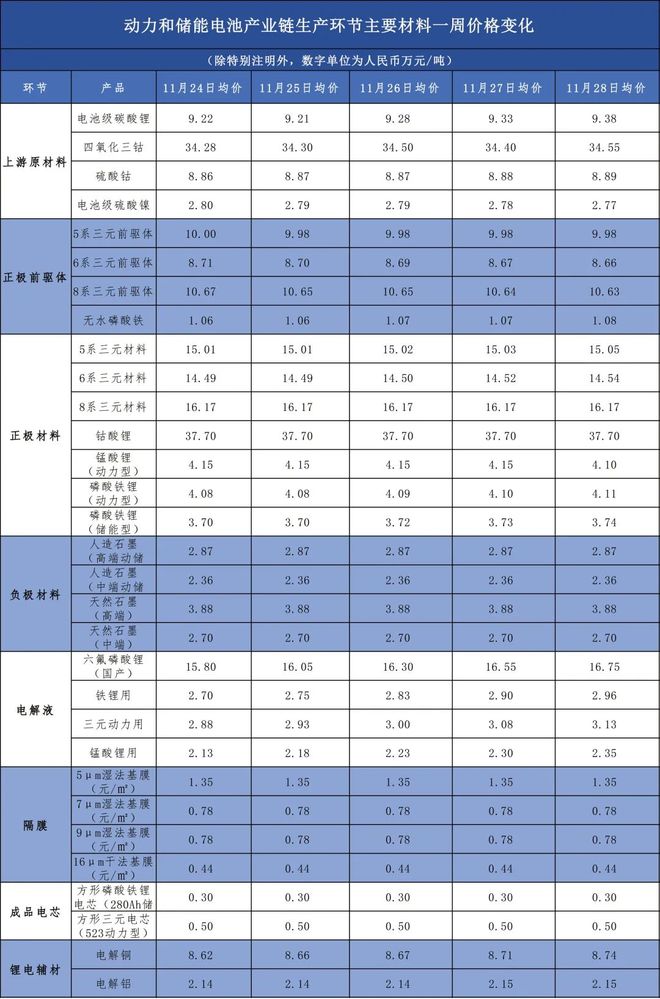 上游原材料价格走势 - 电池级碳酸锂价格先跌后涨,周均价从9.22万元/吨上涨至9.38万元/吨,周末比周初上涨0.16万元/吨 [1][2] - 四氧化三钴价格震荡上涨,周均价从34.28万元/吨上涨至34.55万元/吨,周末比周初上涨0.27万元/吨 [1][2] - 硫酸钴价格持续上涨,周均价从8.86万元/吨上涨至8.89万元/吨,周末比周初上涨0.03万元/吨 [1][2][3] - 电池级硫酸镍价格持续下跌,周均价从2.80万元/吨下跌至2.77万元/吨,周末比周初下跌0.03万元/吨 [1][2][3] 正极前驱体价格走势 - 5系三元前驱体价格有所下跌,周均价从10.00万元/吨下跌至9.98万元/吨,周末比周初下跌0.02万元/吨 [1][2][5] - 6系三元前驱体价格持续下跌,周均价从8.71万元/吨下跌至8.66万元/吨,周末比周初下跌0.05万元/吨 [1][2][5] - 8系三元前驱体价格持续下跌,周均价从10.67万元/吨下跌至10.63万元/吨,周末比周初下跌0.04万元/吨 [1][2][5] - 无水磷酸铁价格有所上涨,周均价从1.06万元/吨上涨至1.08万元/吨,周末比周初上涨0.02万元/吨 [1][2][5] 正极材料价格走势 - 5系三元材料价格持续上涨,周均价从15.01万元/吨上涨至15.05万元/吨,周末比周初上涨0.04万元/吨 [1][2][9] - 6系三元材料价格持续上涨,周均价从14.49万元/吨上涨至14.54万元/吨,周末比周初上涨0.05万元/吨 [1][2][9] - 8系三元材料价格保持稳定,周均价维持在16.17万元/吨 [1][2][7] - 钴酸锂价格保持稳定,周均价维持在37.70万元/吨 [1][2][7] - 动力型锰酸锂价格有所下跌,周均价从4.15万元/吨下跌至4.10万元/吨,周末比周初下跌0.05万元/吨 [1][2][11] - 动力型磷酸铁锂价格持续上涨,周均价从4.08万元/吨上涨至4.11万元/吨,周末比周初上涨0.03万元/吨 [1][2][11] - 储能型磷酸铁锂价格持续上涨,周均价从3.70万元/吨上涨至3.74万元/吨,周末比周初上涨0.04万元/吨 [1][2][11] 电解液及关键材料价格走势 - 六氟磷酸锂(国产)价格大幅上涨,周均价从15.80万元/吨上涨至16.75万元/吨,周末比周初上涨0.95万元/吨 [1][2][13] - 自9月12日以来,六氟磷酸锂(国产)价格已累计上涨10.95万元/吨,涨幅达195.54% [13] - 铁锂用电解液价格持续上涨,周均价从2.70万元/吨上涨至2.96万元/吨,周末比周初上涨0.26万元/吨 [1][2][13] - 三元动力用电解液价格持续上涨,周均价从2.88万元/吨上涨至3.13万元/吨,周末比周初上涨0.25万元/吨 [1][2][13] - 锰酸锂用电解液价格持续上涨,周均价从2.13万元/吨上涨至2.35万元/吨,周末比周初上涨0.22万元/吨 [1][2][13] 其他材料及成品价格走势 - 负极材料(高端/中端人造石墨、天然石墨)价格本周保持稳定 [1][2] - 隔膜(5μm/7μm/9μm湿法基膜、16μm干法基膜)价格本周保持稳定 [1][2] - 方形磷酸铁锂电芯(280Ah储能型)价格保持稳定,为0.30元/Wh [1][2] - 方形三元电芯(523动力型)价格保持稳定,为0.50元/Wh [1][2] - 电解铜价格持续上涨,周均价从8.62万元/吨上涨至8.74万元/吨,周末比周初上涨0.12万元/吨 [1][2][15] - 电解铝价格有所上涨,周均价从2.14万元/吨上涨至2.15万元/吨,周末比周初上涨0.01万元/吨 [1][2][15]