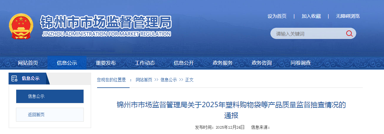 辽宁省锦州市市场监督管理局通报2025年塑料购物袋等产品质量监督抽查情况